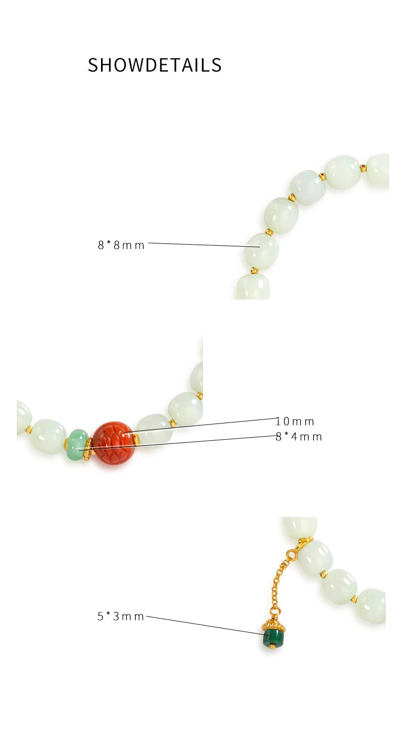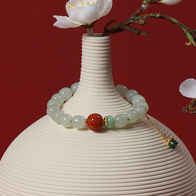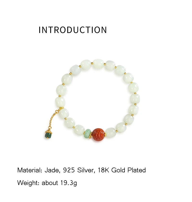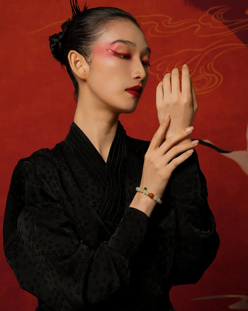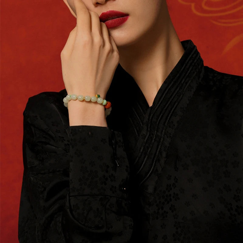 This bracelet pairs three ancient materials—white jade, green jasper and amber—into a single, wearable talisman. Each round bead is polished to a gentle sheen and strung on a flexible elastic cord so the piece drapes softly around the wrist, like a small circlet of quiet confidence. Its appearance is vintage and timeless: round charms and warm tones that remind the eye of old lacquer, river stones smoothed by time, and sunlight held in resin.