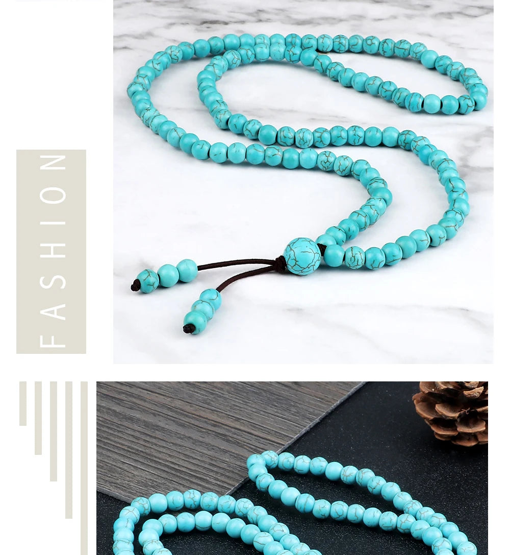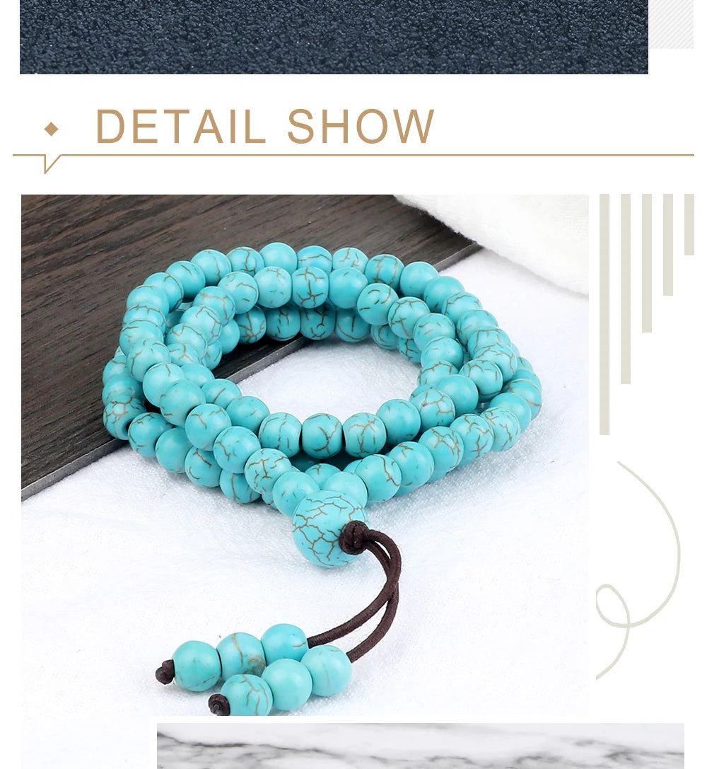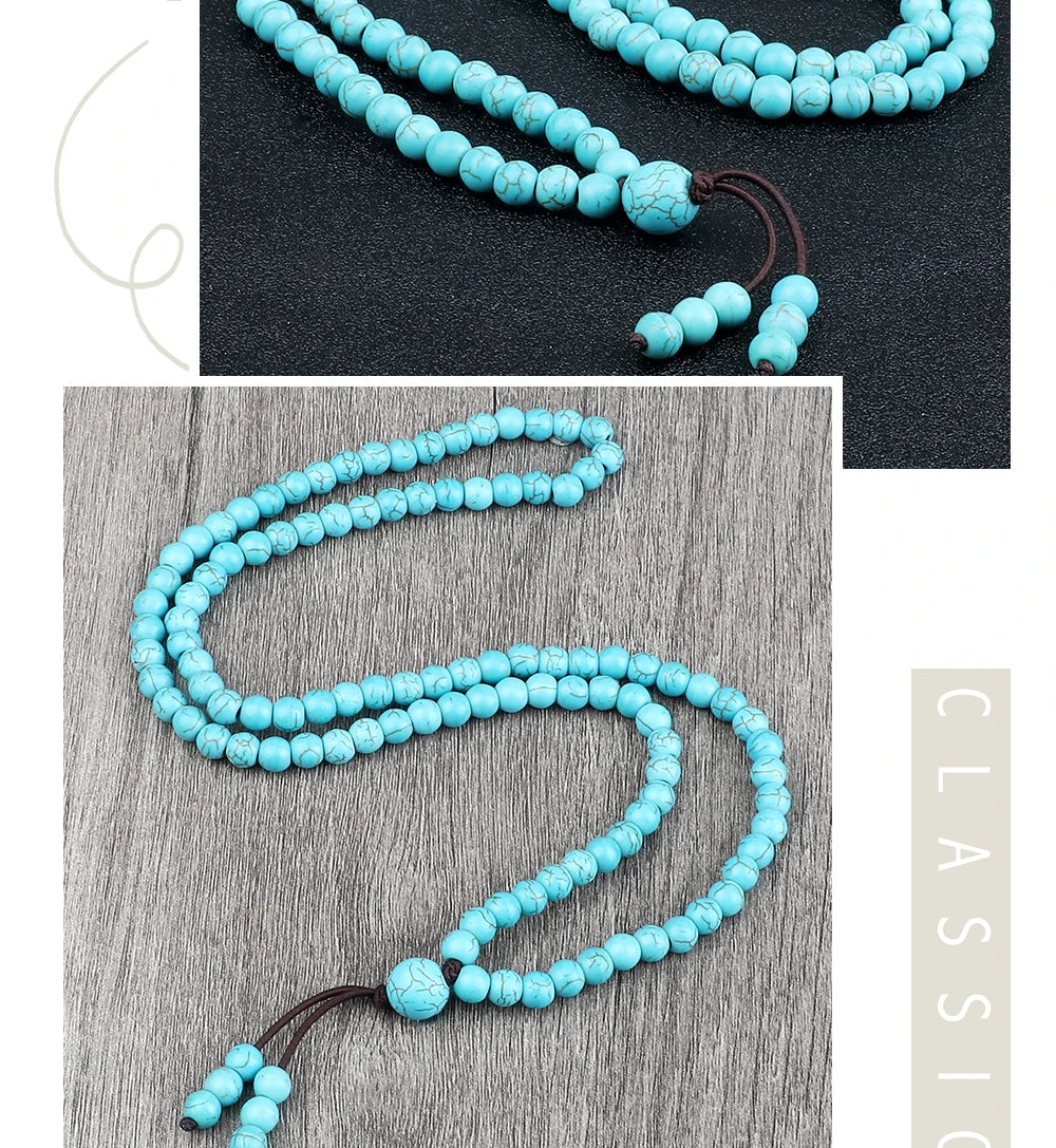 这款念珠以天然浅蓝石珠手工串制,珠径6mm,握感轻盈不累赘;弹力绳结构让它既可为长项链,也可多圈缠腕成为灵动手链,护持你于日常与修习之间自由切换。