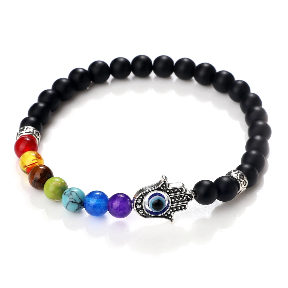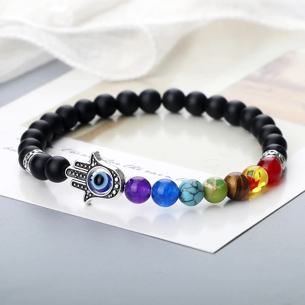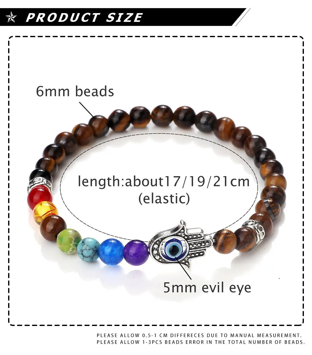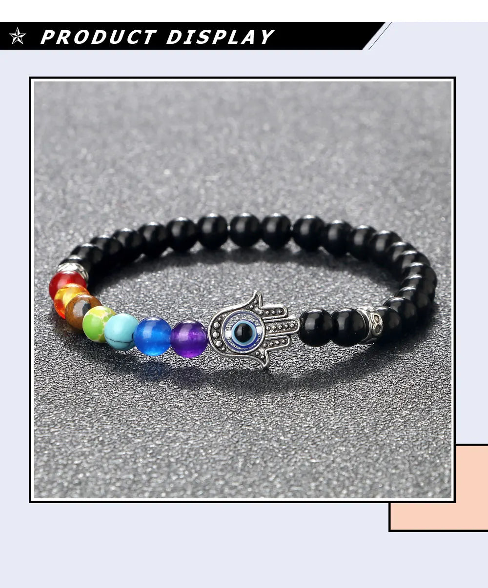 七色能量珠和掌形邪眼护符的组合非常到位!6mm颗粒贴肤不突兀,弹力绳上手就能戴,运动也不影响。颜色顺序清晰,冥想时很有仪式感,整体做工细致,细节加分。
