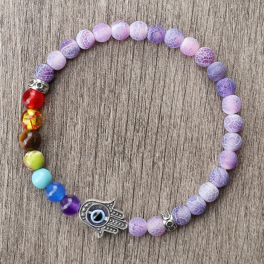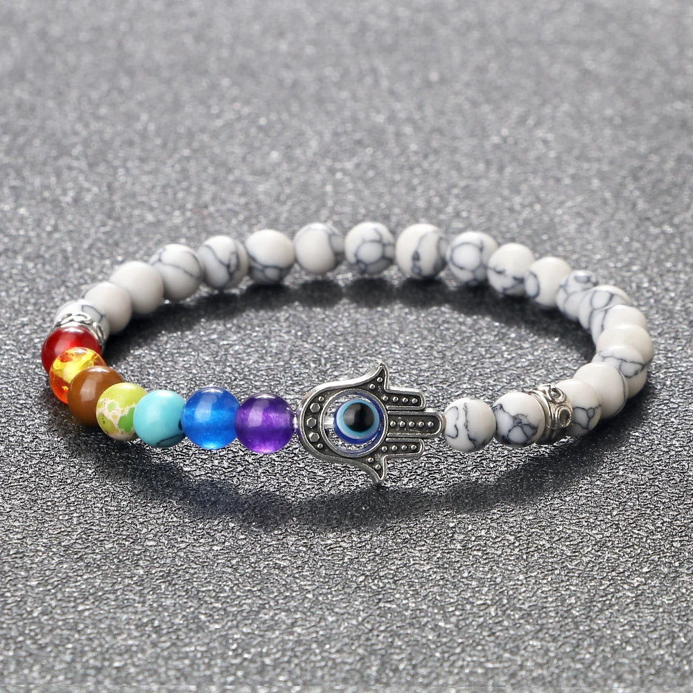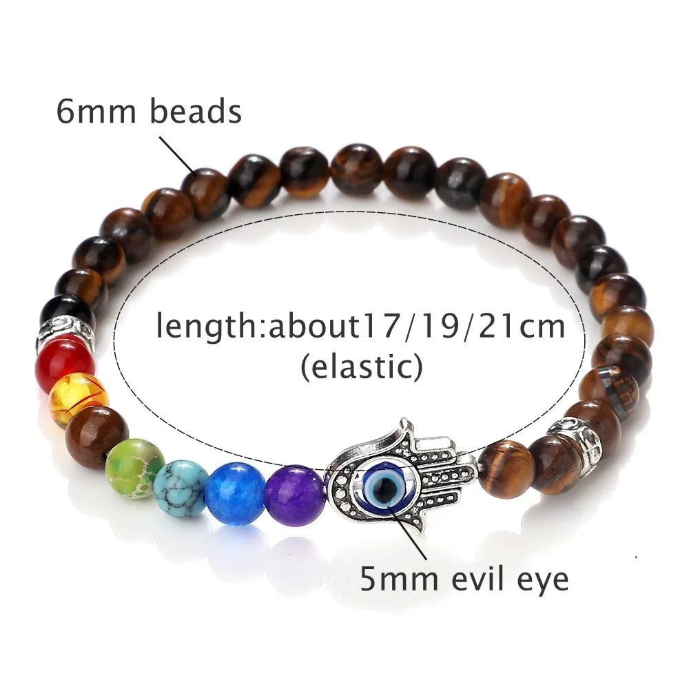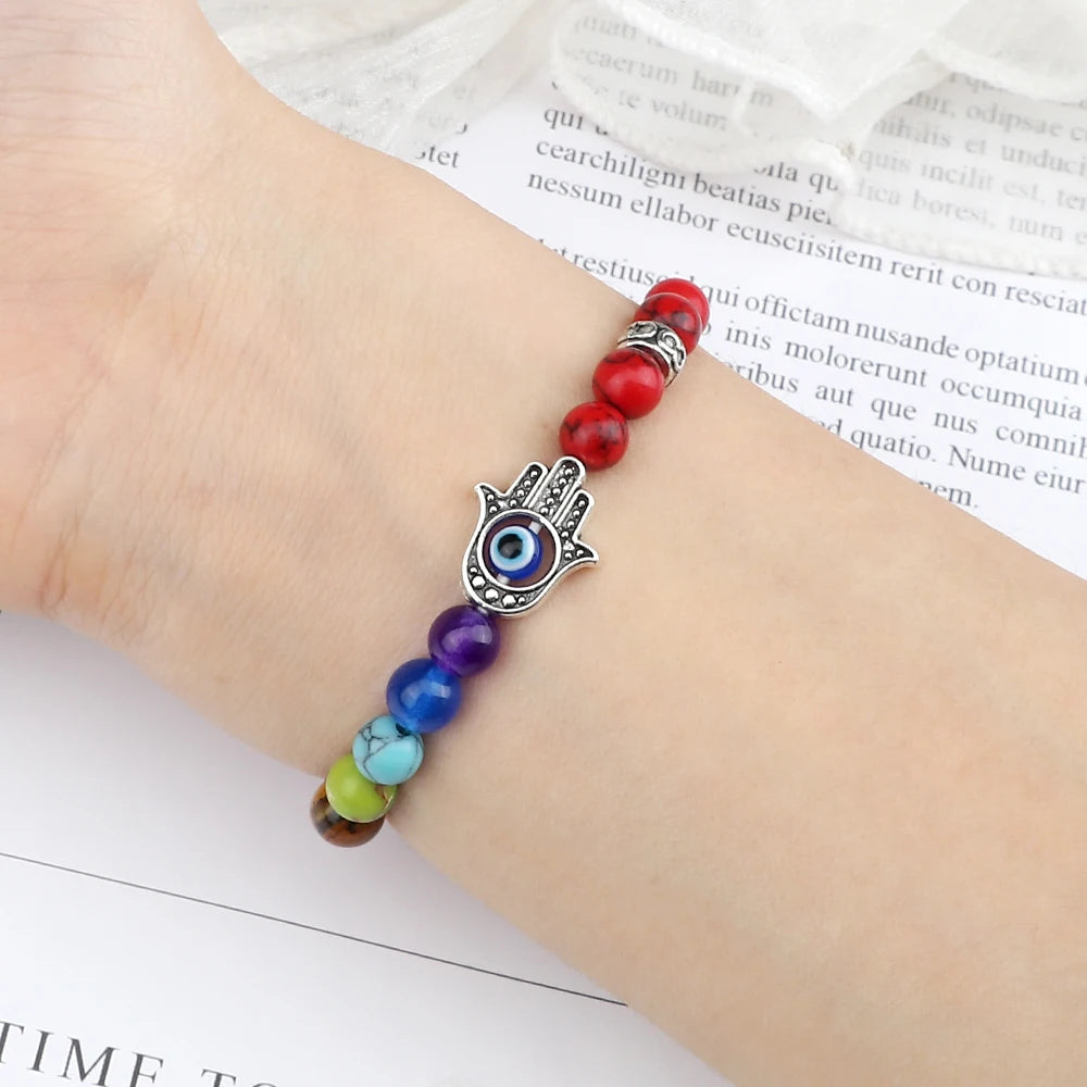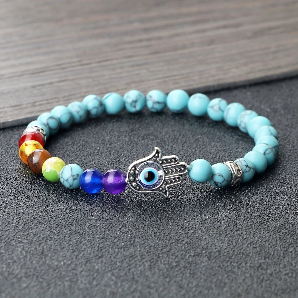 七色能量珠和掌形邪眼护符的组合非常到位!6mm颗粒贴肤不突兀,弹力绳上手就能戴,运动也不影响。颜色顺序清晰,冥想时很有仪式感,整体做工细致,细节加分。