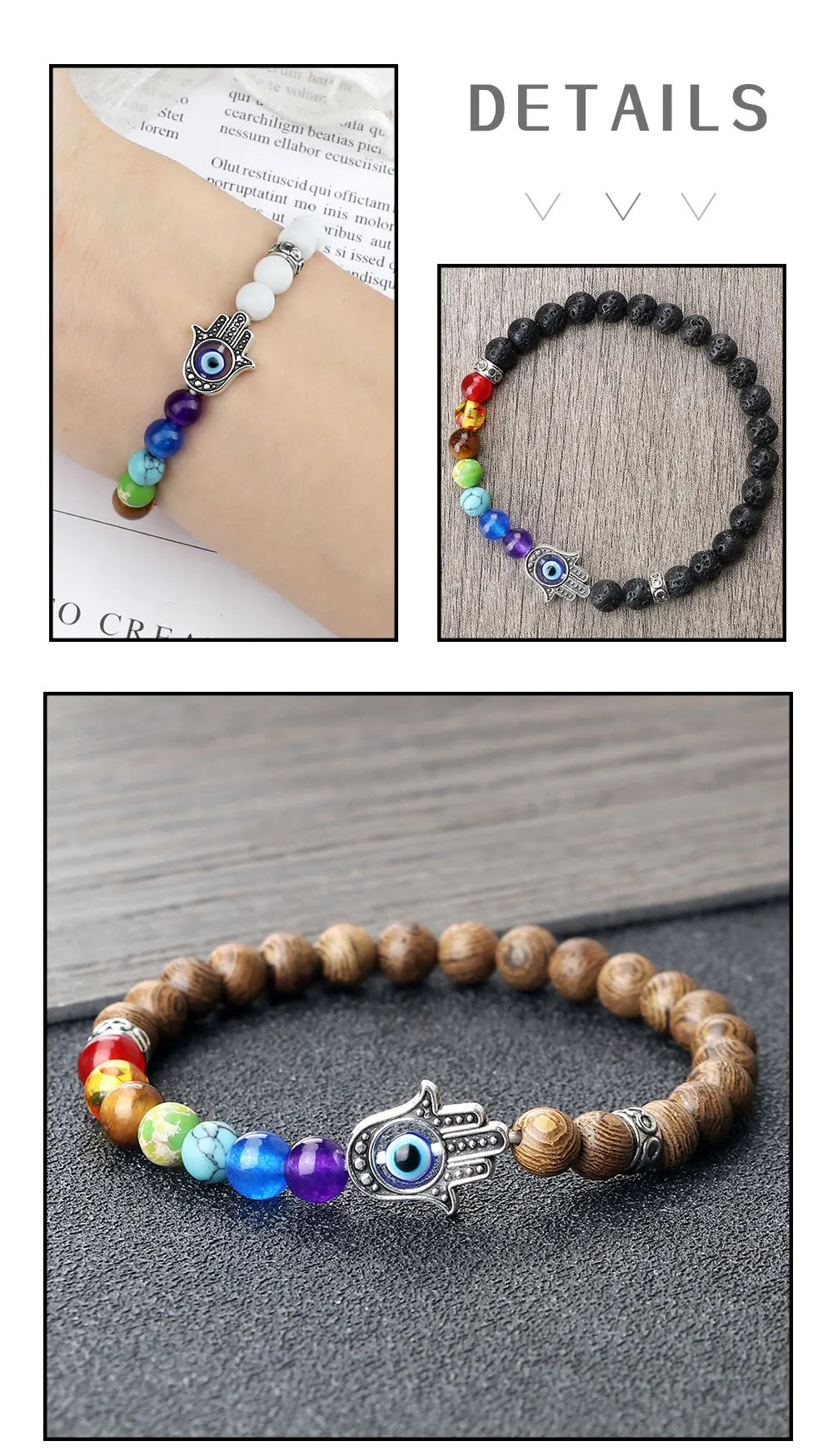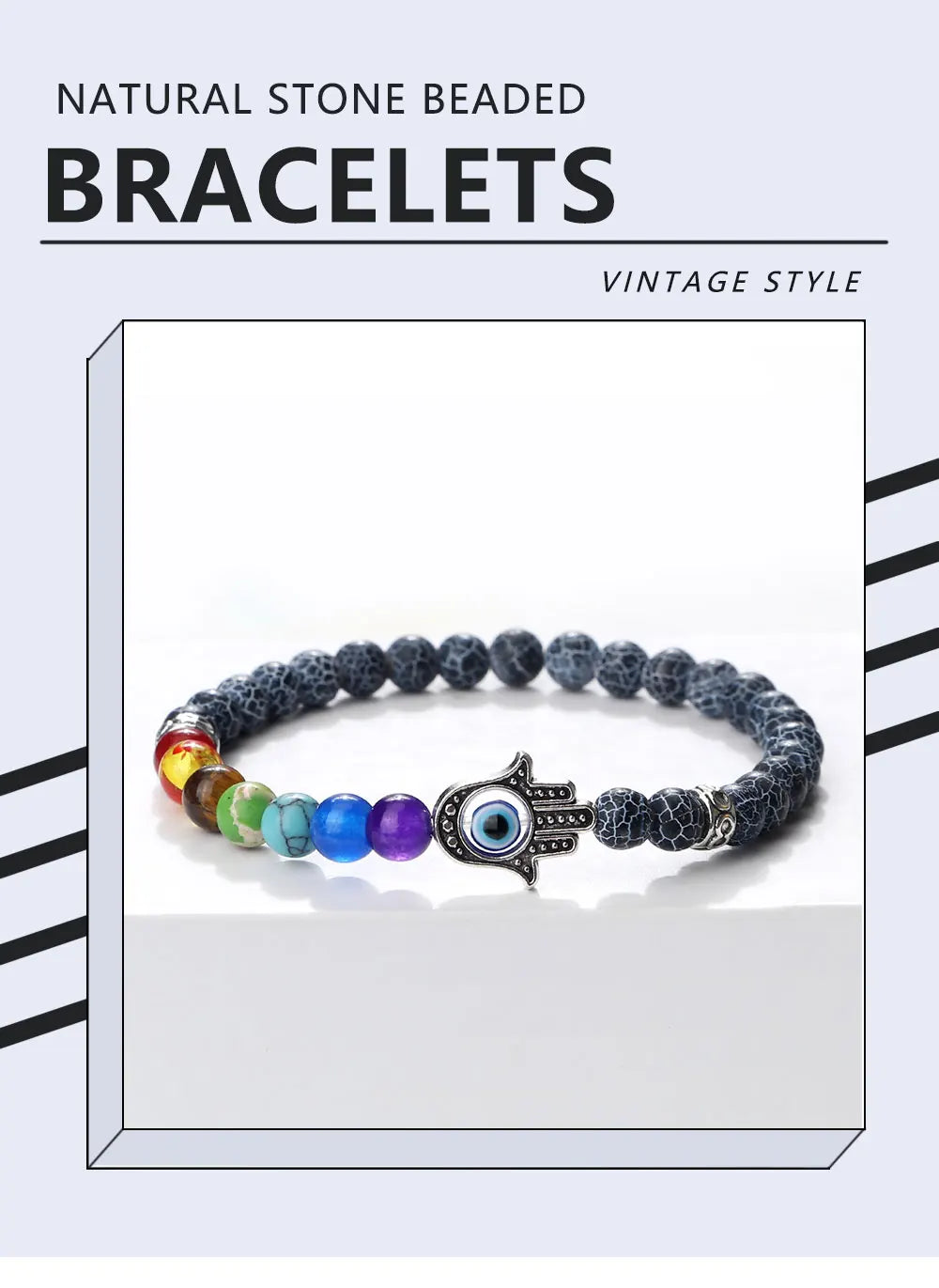 此手链以6mm天然石圆珠为载体,选七色为序,辅以掌形邪眼护符为阵眼。掌代护,眼代明;一护一明,如昼夜相生,令佩戴者身侧常有清明之气,负能难近。