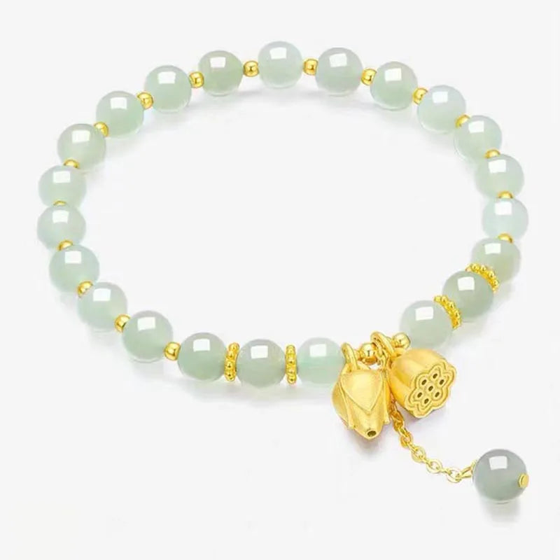 This delicate bracelet gathers the quiet virtue of Hetian jade into a string of 6mm beads, crowned with a single lotus pendant. In material and manner it is modest: green‑white jade nods to gentle clarity, six millimetre beads sit lightly on the wrist, and a zinc‑alloy lotus ring offers an ethnic, slightly vintage accent. Yet within that simplicity rests a long cultural memory—of stones worn as talismans, of the lotus as a symbol of purity, and of adornments that teach the wearer to carry intention with everyday grace.