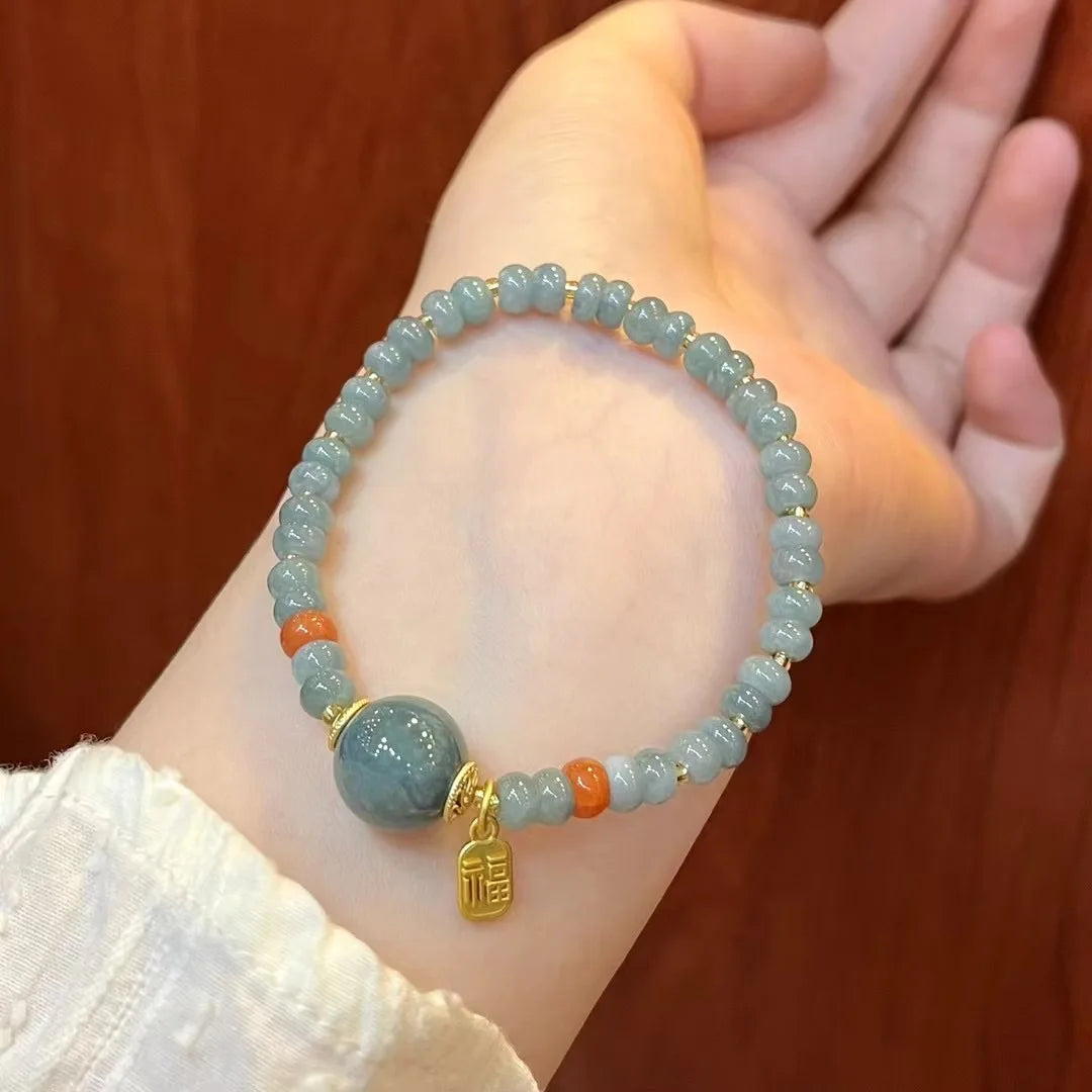 From the perspective of feng shui, blue-green jade harmonizes wood and water elements: it soothes emotion, supports clarity of mind, and symbolically nurtures growth. The rope-chain bead arrangement creates a subtle, continuous circle on the wrist — an echo of the ancient idea that life is a cycle of change and return. The bracelet asks for no magic; rather, it invites a gentle practice: a mindful moment when you touch the beads, recall your intention, and center your breath. As the old aphorism goes, '心诚则灵' — sincerity of heart awakens response — reminding us that inner calm often precedes outward good fortune.