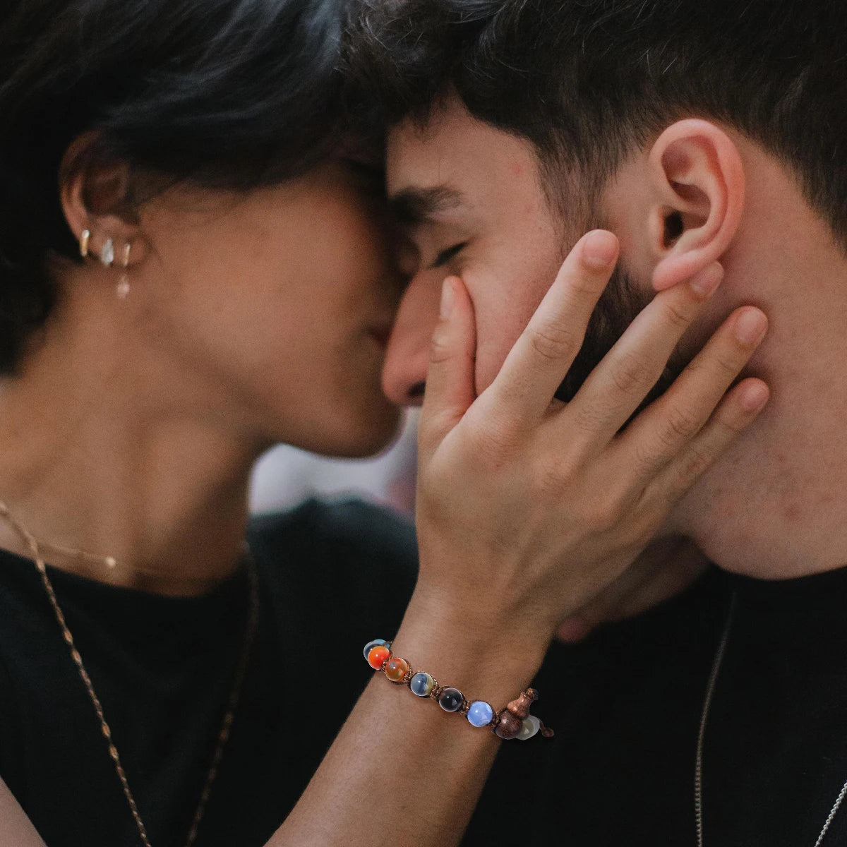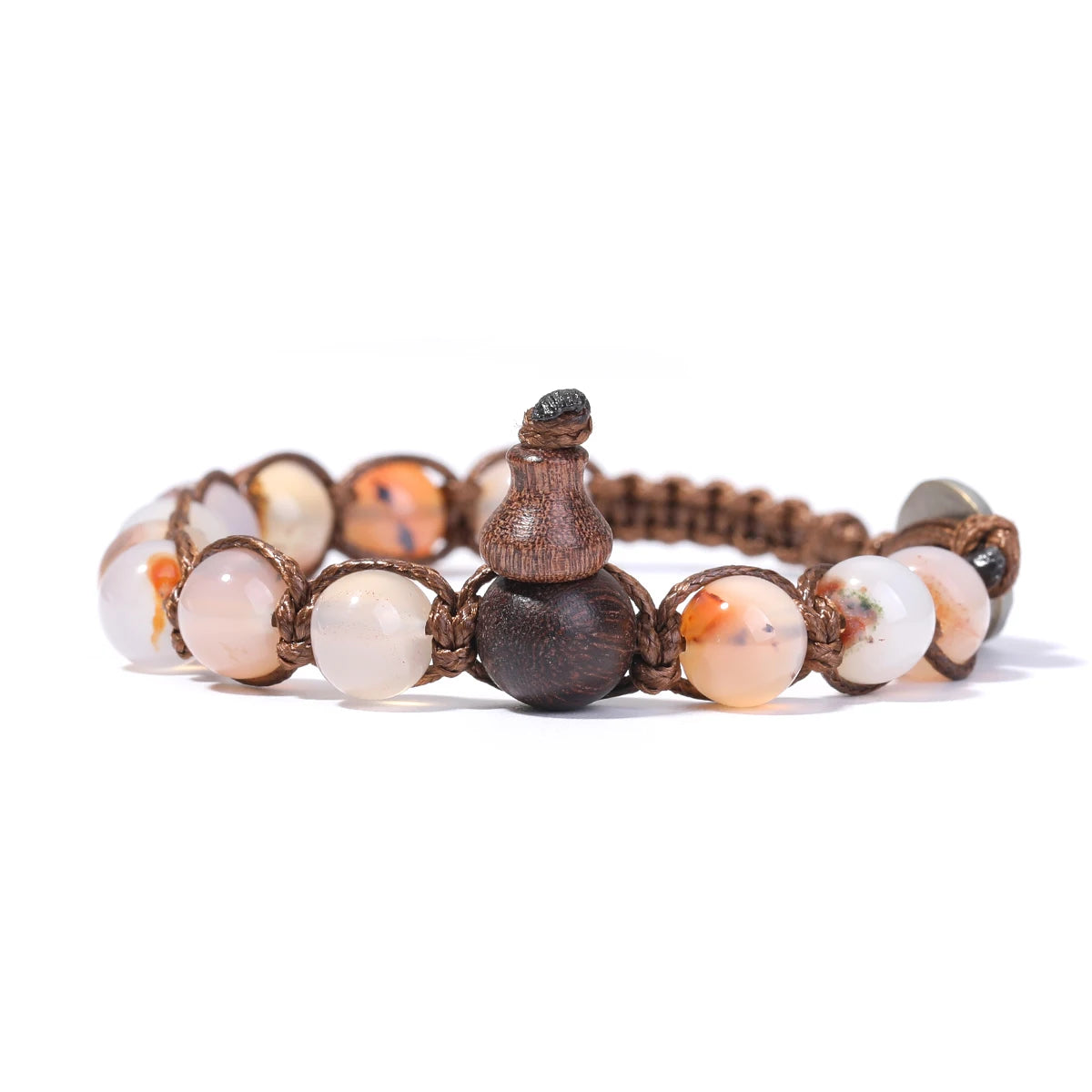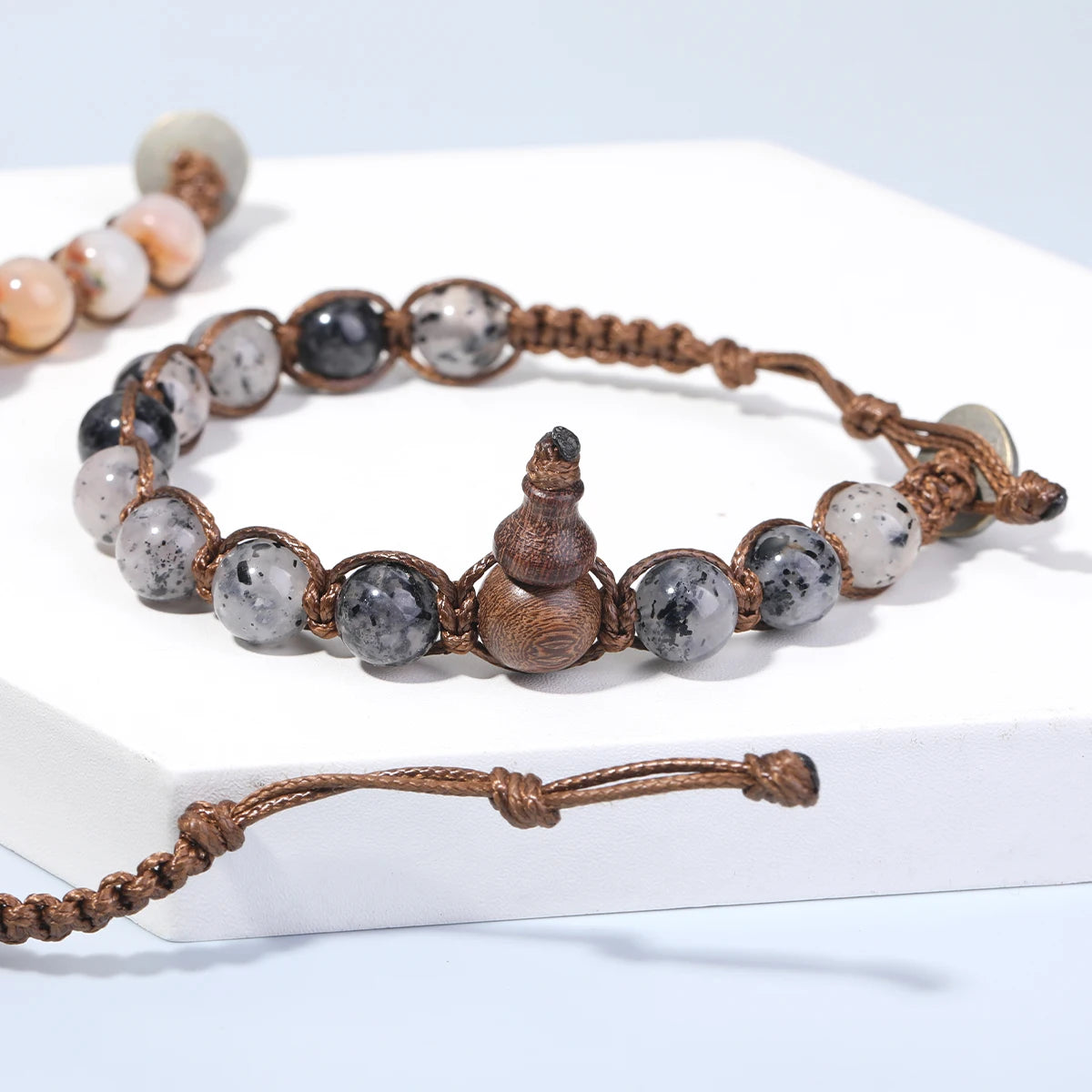 这款手链以天然石主珠为心,辅以多色祈福绳手工编织。五色寓意五行合和、五方守护:青为生发,红为旺势,黄为厚德,白为清明,黑为镇定。金刚结结构坚实,象征不动如山的护佑之力,让佩戴者在人事纷繁中,仍能安定自持。