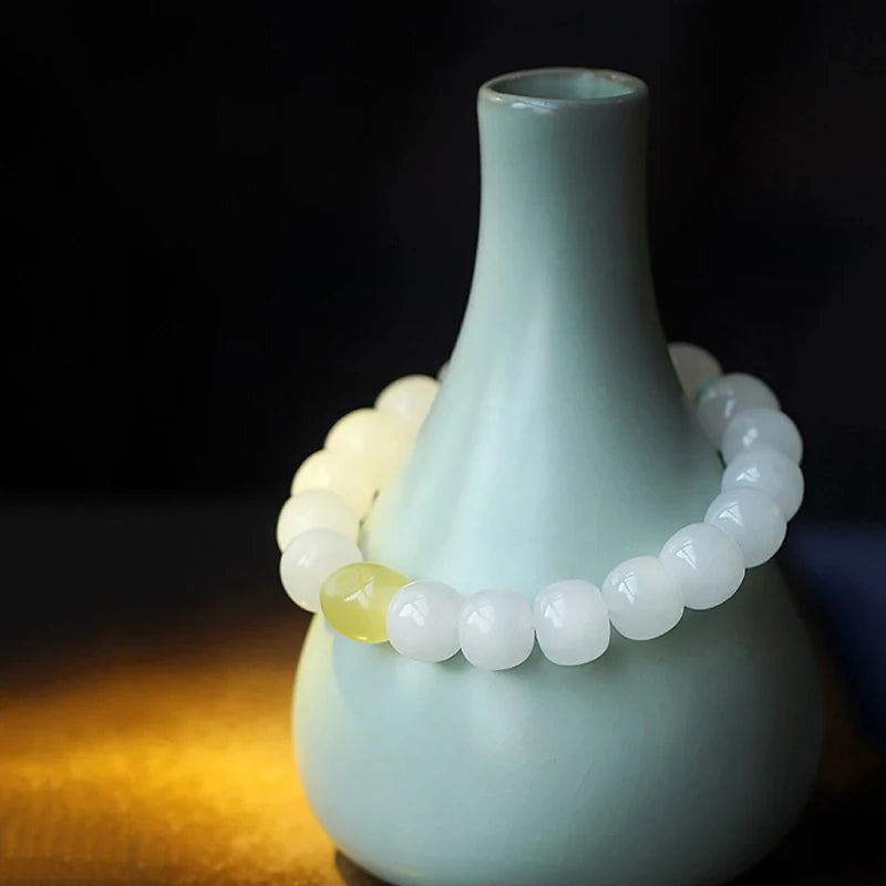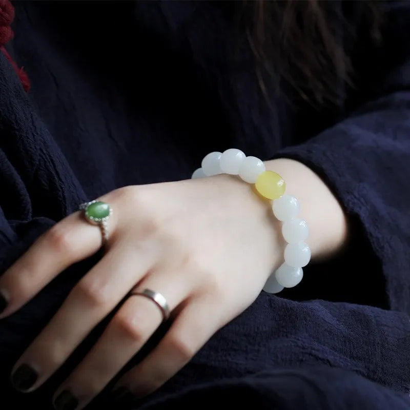In the language of traditional Chinese aesthetics, white jade (白玉) speaks of purity and clarity; jasper (碧玉/碧石) answers with rootedness and protection. Together they embody a balance long valued in classical thought: one as the bright mind, the other as the steady heart. The bracelet's materiality—stone against skin, cool surface warmed by the pulse—becomes a simple ritual each time it is worn, a small anchor toward steadiness amid change.