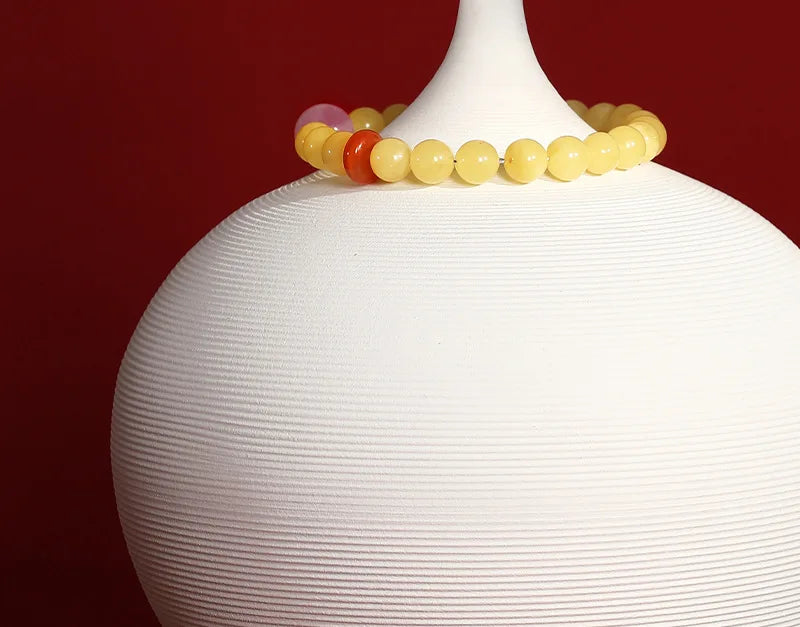 In the wisdom of the classics there is guidance for such adornment. The I Ching teaches that the movement of heaven is constant and self-strengthening. Worn close to the pulse, this bracelet becomes a small instrument of harmony, reminding the wearer to be steady amid change. Daoist thought values harmony of yin and yang; the warm amber hue and the cool jade texture form such a union, calming emotion while supporting clear action.