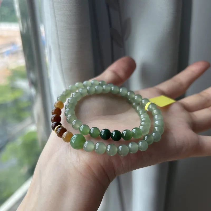 和田玉,自古为华夏重宝,文人墨客以玉比德,孔子有言“君子比德于玉”,其温润凝重,既是饰物,亦寓心性。此款和田玉渐变多宝双圈6MM珠串,以天然和田玉为主料,匠心呈现渐变色阶,珠径匀为6MM,手感圆润,线结稳固,复古而不古板,简约而含蓄,正合现代人“以物炼心”的美学。