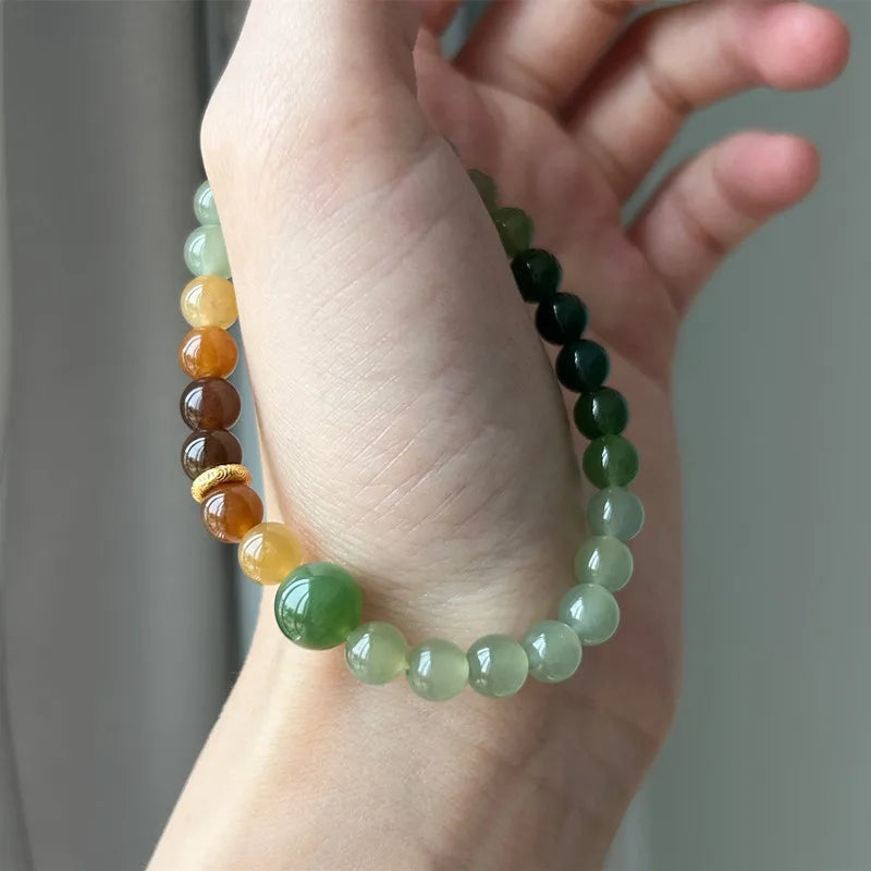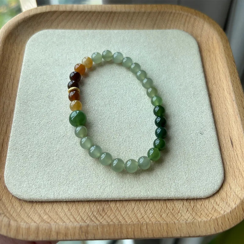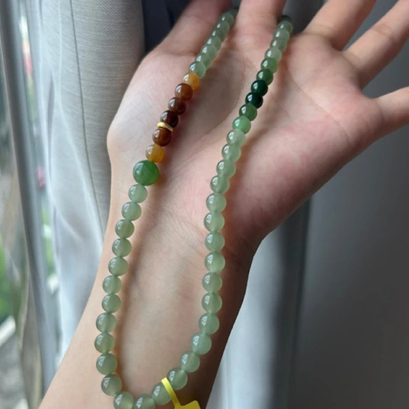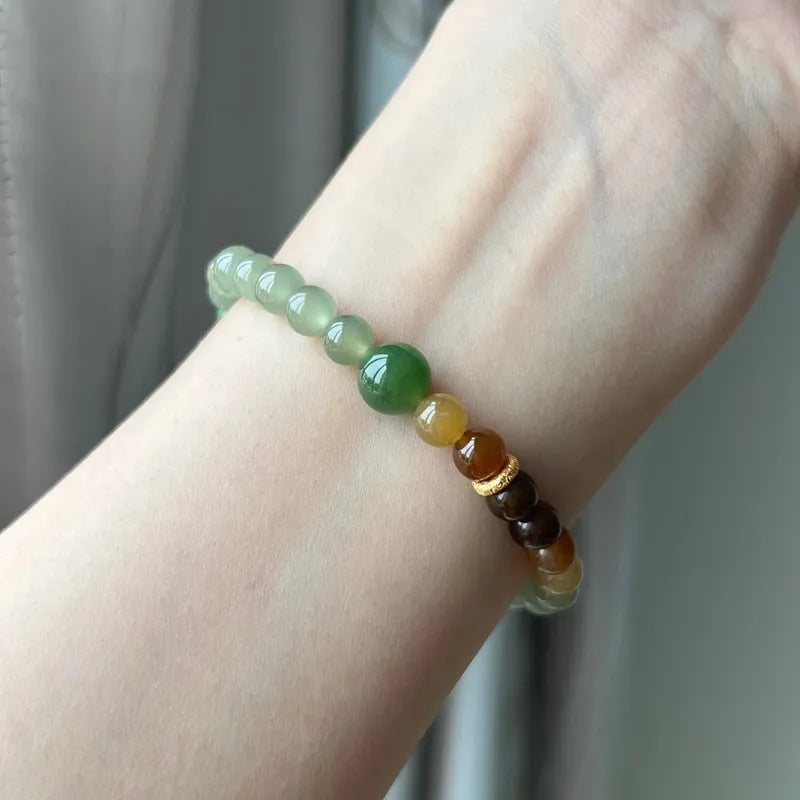 《易经》有云:“一阴一阳之谓道。”本串以渐变色为表,隐喻阴阳调和:色深者如潜藏之气,浅者若舒展之光,珠链环绕,如运转不息之天道。佩之于身,可视为提醒与守护——修身以待时,立德而行善。道家“道法自然,万物自化”的从容亦在其中,佩戴时自能感受节律的平和。