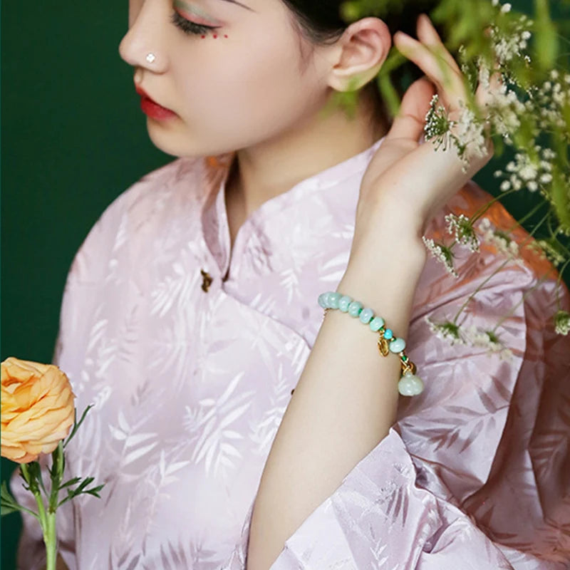In traditional symbolism the gourd is a vessel of life and protection, often associated with long life, offspring and the containment of beneficial qi. As the ancient masters taught, forms can carry meaning and intention; here the gourd pendant becomes a humble receptacle for auspicious hopes. The Tibetan-silver elements add subtle contrast and an aged, spiritual texture — reminiscent of travel charms and monastic beads — without overwhelming the bracelet's feminine simplicity.