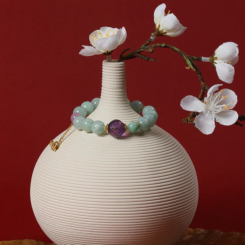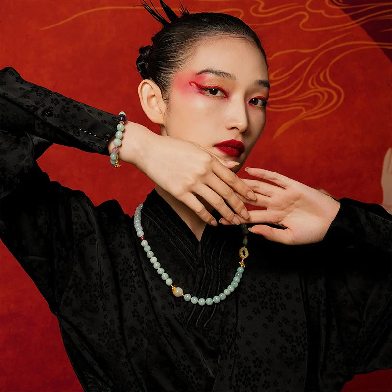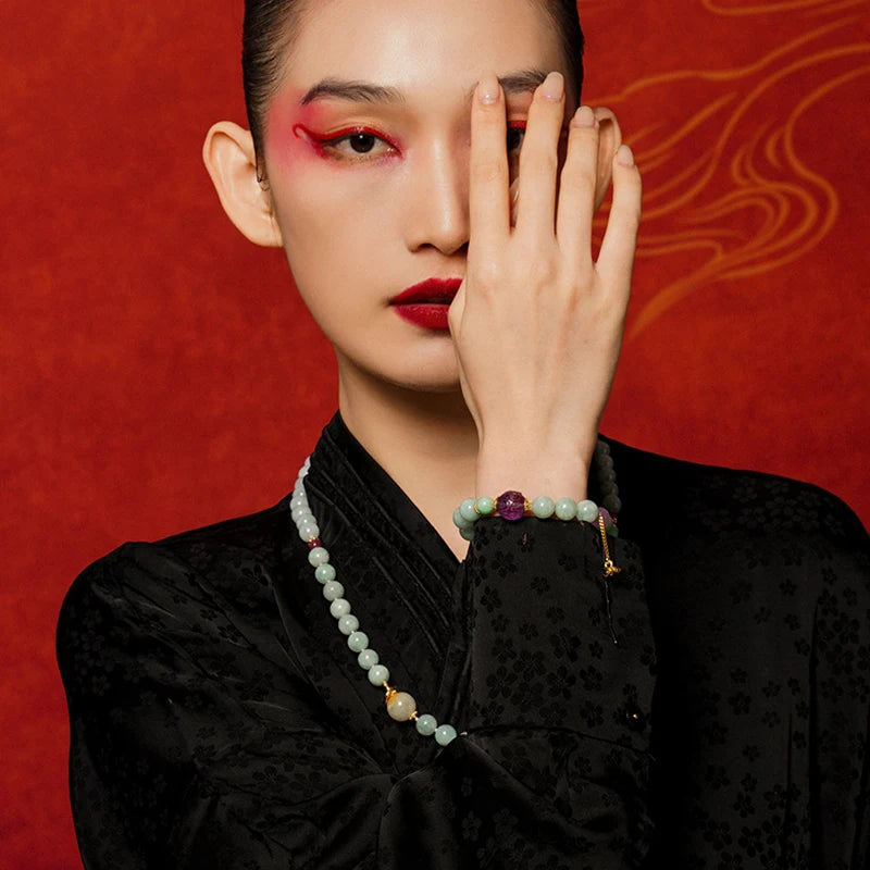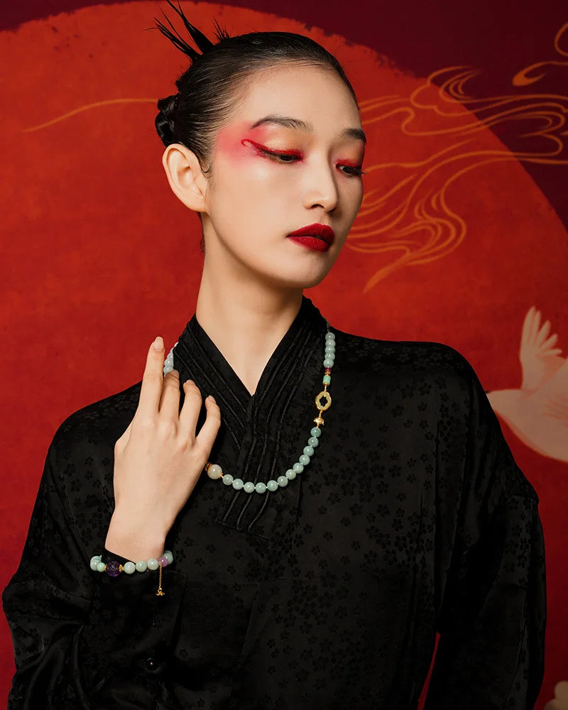 佛学讲究“心净则莲开”,佩玉亦如修心一事:以外物为助,内修为本。此手链在生活中提醒佩戴者保持宁静、宽容与温和的态度,凡事以善念处之,气色自显、关系自和。民间亦有佩玉以寄寓祝福之俗,赠母以表孝,赠侣以寄相守,皆为人际间温暖的符号。