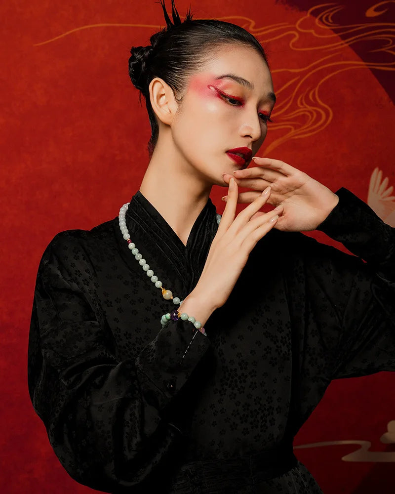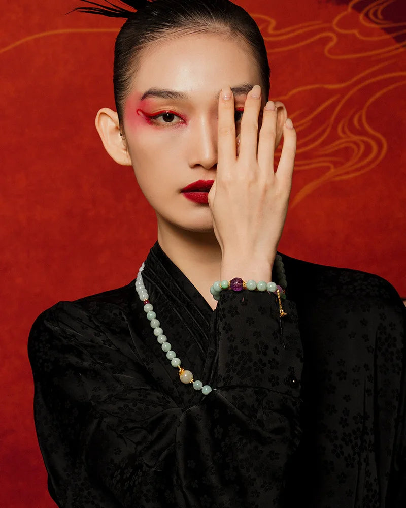 “天行健,君子以自强不息。”玉之为物,平和而坚韧,佩于腕间,象征持守本心、温润自持。本作将和田玉与半宝石并列,辅以绳链与圆形珠体,正如《易》所述的“阴阳相生”,圆珠为阳之圆融,绳链为柔之持重,二者相济,呈现一阴一阳之道。