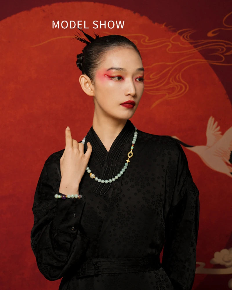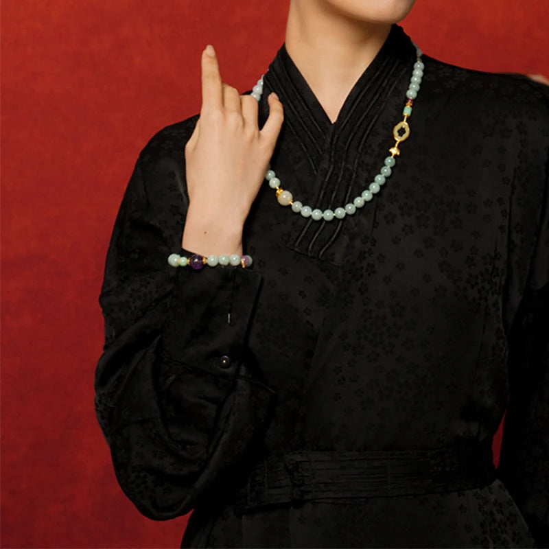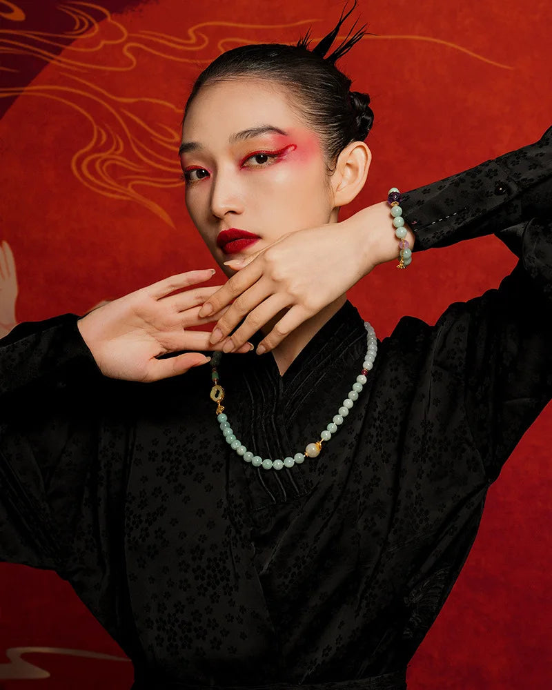 此链既是一件饰品,也是承载祝福的物件。它以和田玉的温润、半宝石的色泽与绳链的朴素结合,构成一份可触的传统与当代交织的美学。愿佩戴者心怀坦然,岁月温柔,行稳致远,家人安康,情深长久。