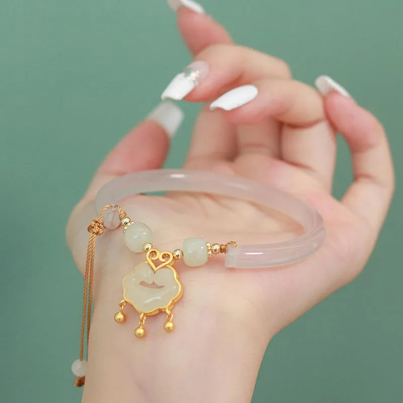Wear it alone for a quiet, meditative accent; pair it with other minimalist pieces to let jade remain the gentle lead. Care is simple: avoid harsh chemicals and prolonged soaking; a soft cloth will maintain its sheen. More than ornament, this Hotan white jade safety‑lock bracelet is a small philosophy in form—invoking balance from classic thought, protection from gentle material power, and an invitation to live with poise.