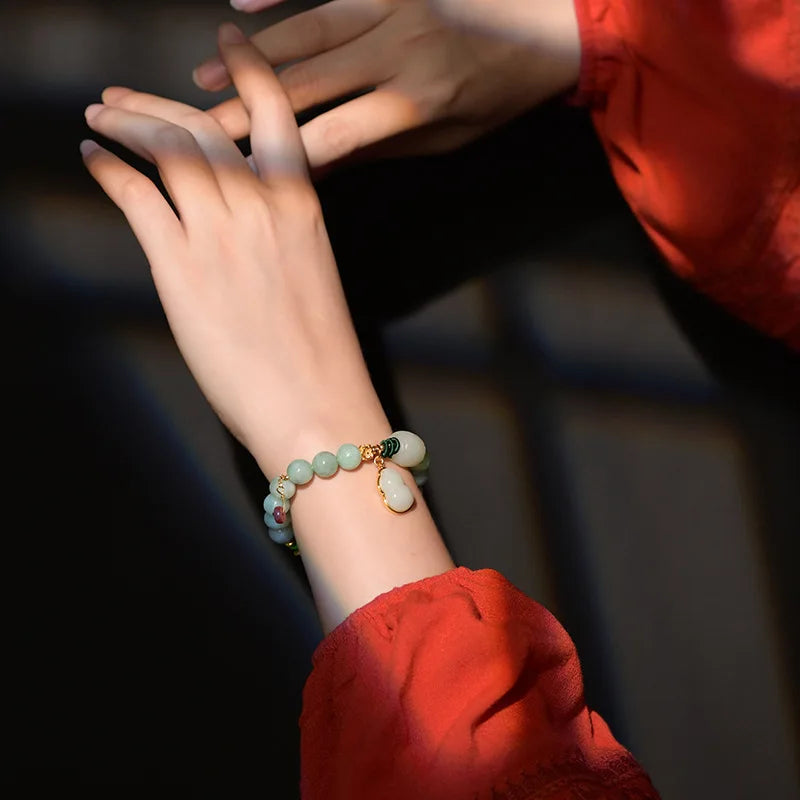 This bracelet marries natural jade beads with a small calabash charm and a braided white rope, finished with a 925 silver needle closure. In material and making it is simple yet purposeful: the jade is chosen for its subtle translucence and smooth touch, the calabash carved in miniature as a vessel of auspices, and the braided rope crafted for flexibility and the intimate warmth of handwork.