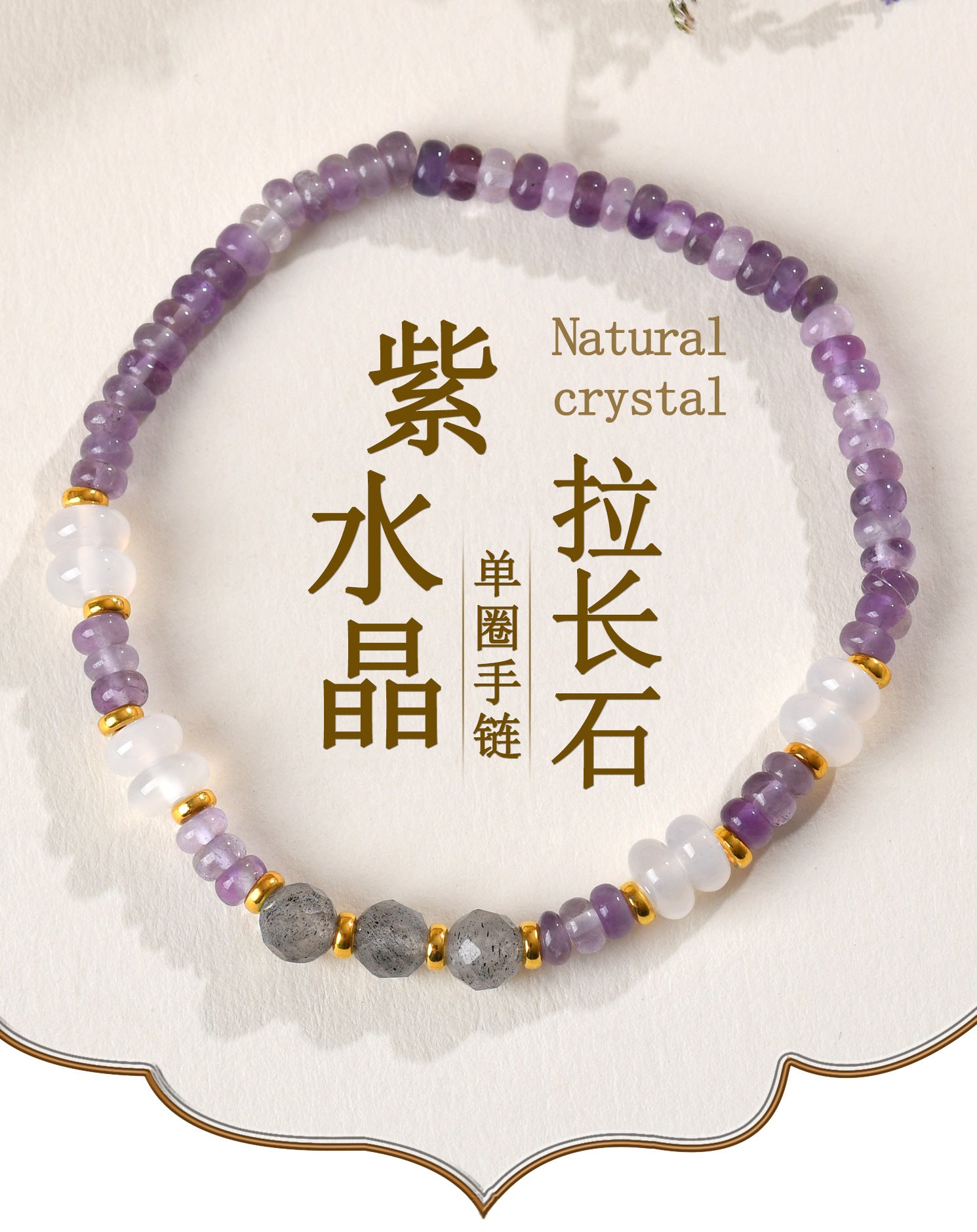 Feng shui traditions hold that purple crystals like amethyst attract wealth and nobility by activating the wealth sector in one's environment. Placed on the left wrist—the receiving side—it draws in prosperity and peace. Moreover, the circular bead pattern signifies the endless cycle of life and renewal, echoing the Buddhist concept of impermanence and the beauty of mindful living.