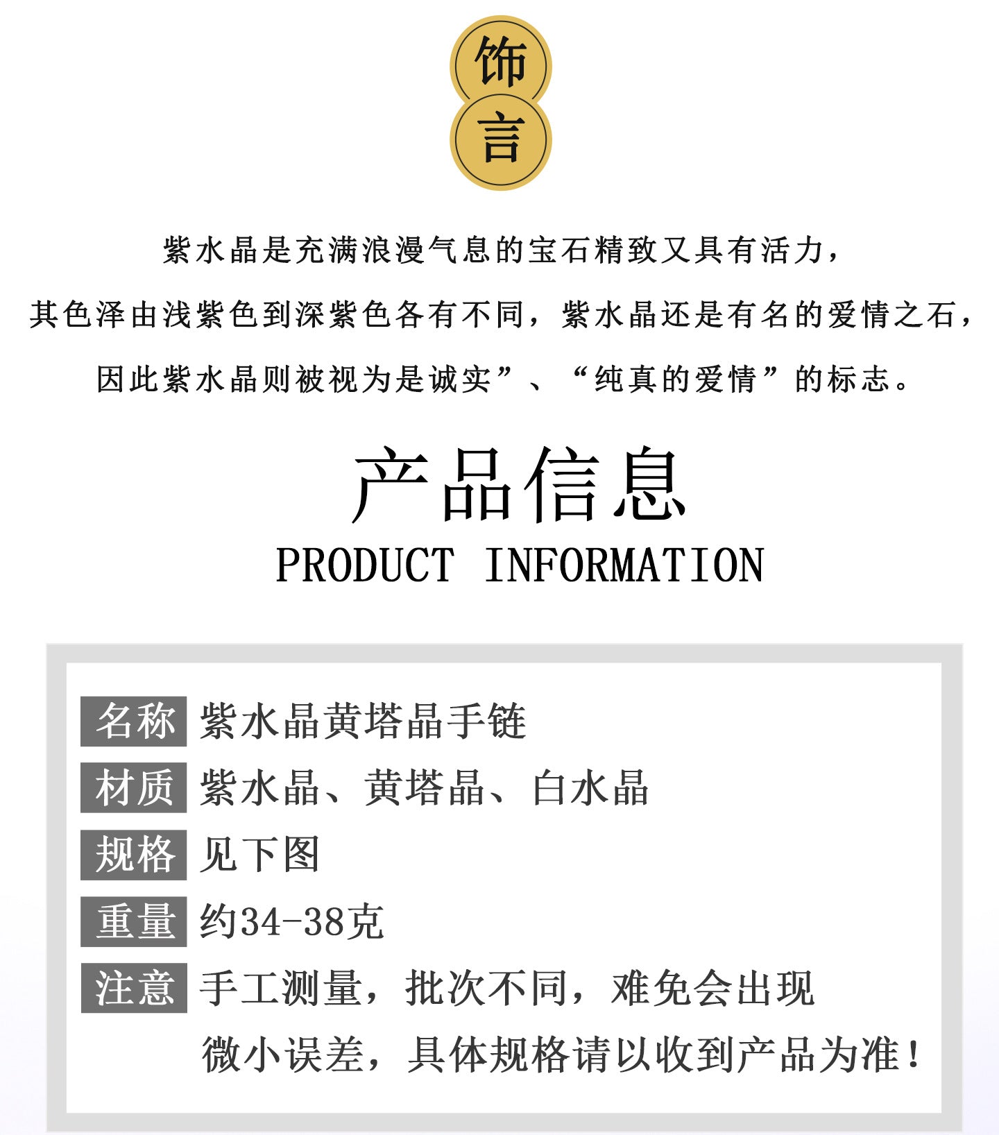 This bracelet combines amethyst, yellow tower, and white crystals in a romantic style, perfect for daily wear to enhance your spiritual journey.