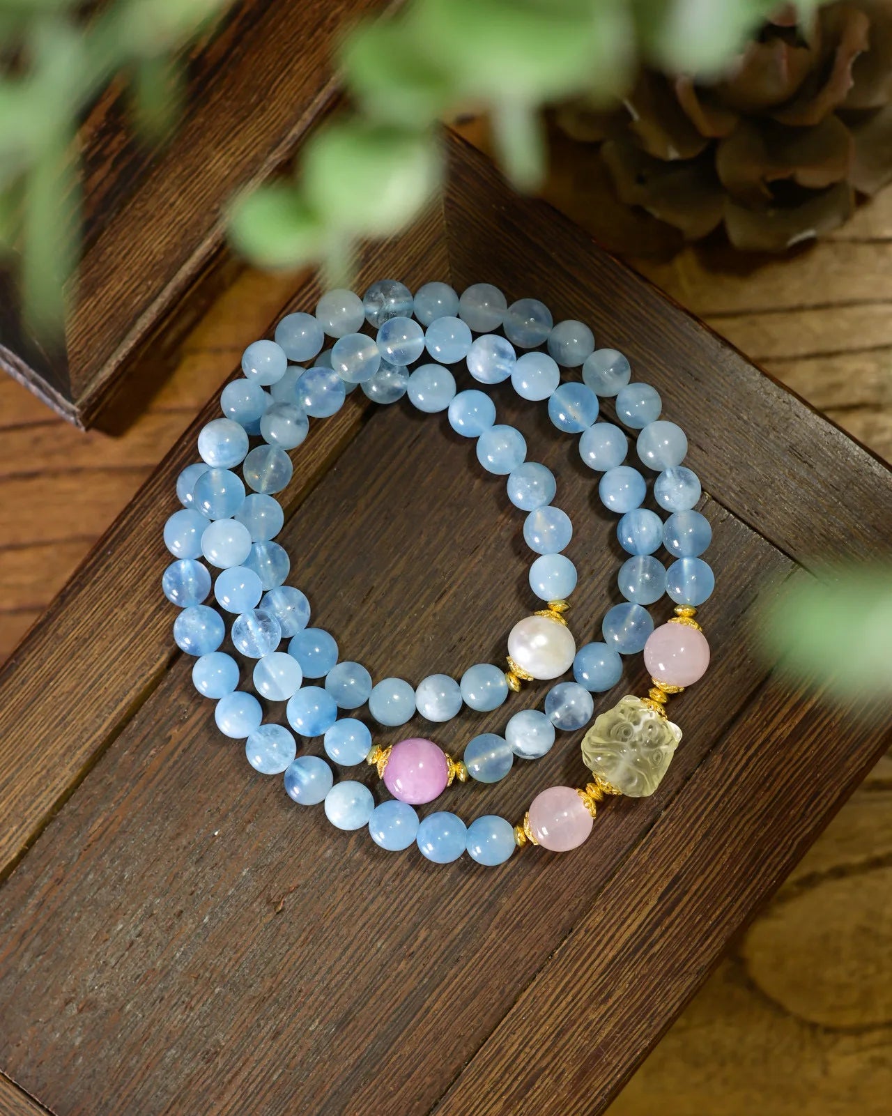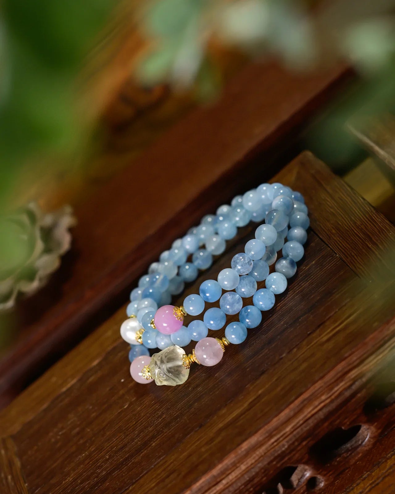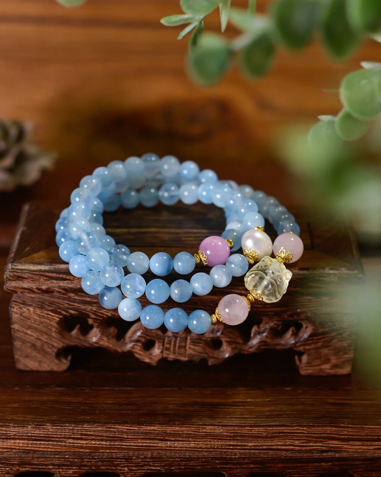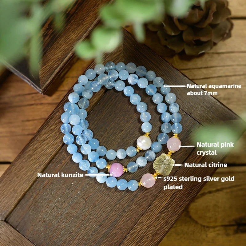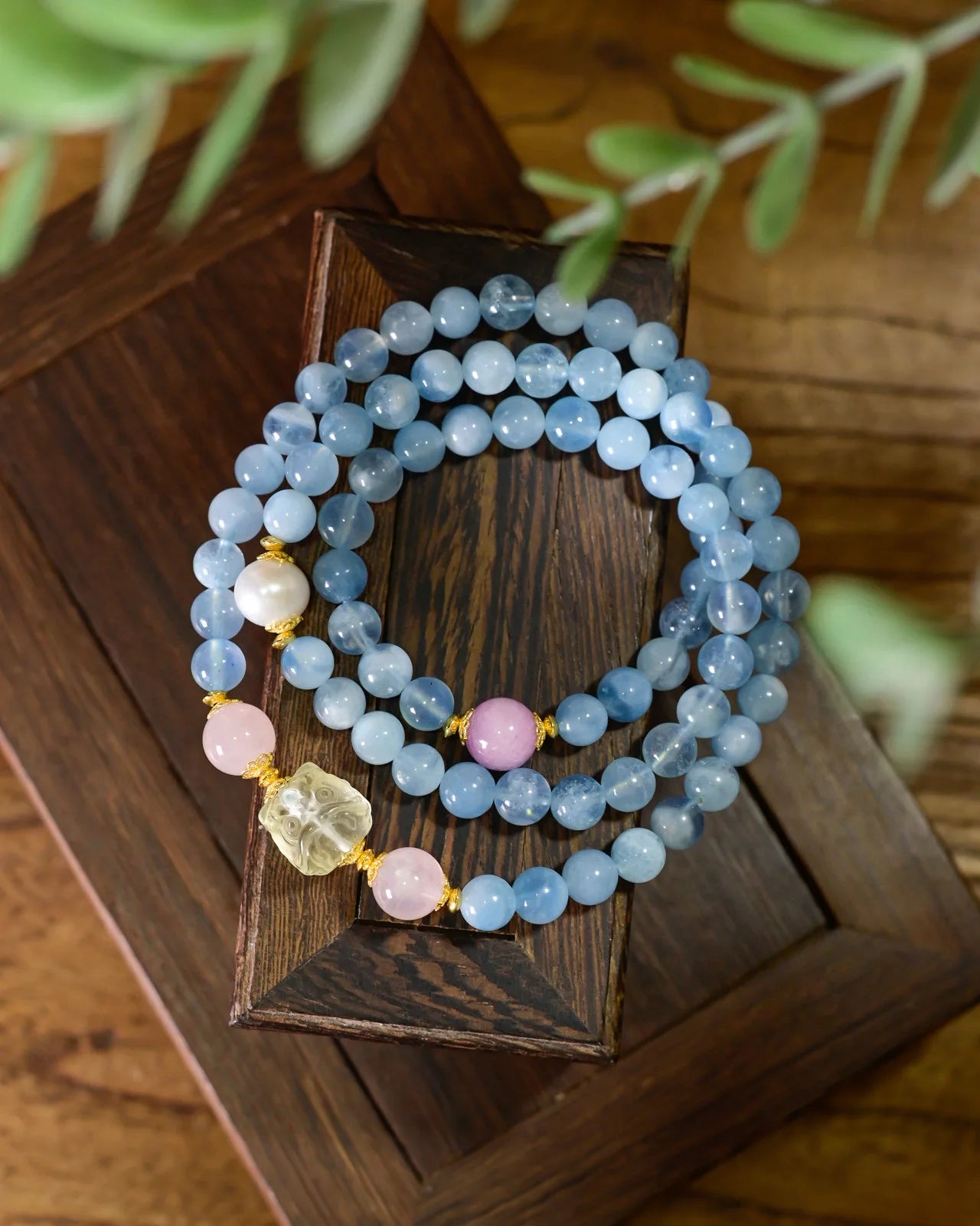 这串层叠手链以天然海蓝宝为核心,辅以黄水晶与昆士石,并以925纯银链承接一枚狮子护符。狮子象征勇猛与贵人,亦能化煞护宅;层叠的珠链如同阶梯般引导能量向上聚集,象征“层层有进,步步得财”。