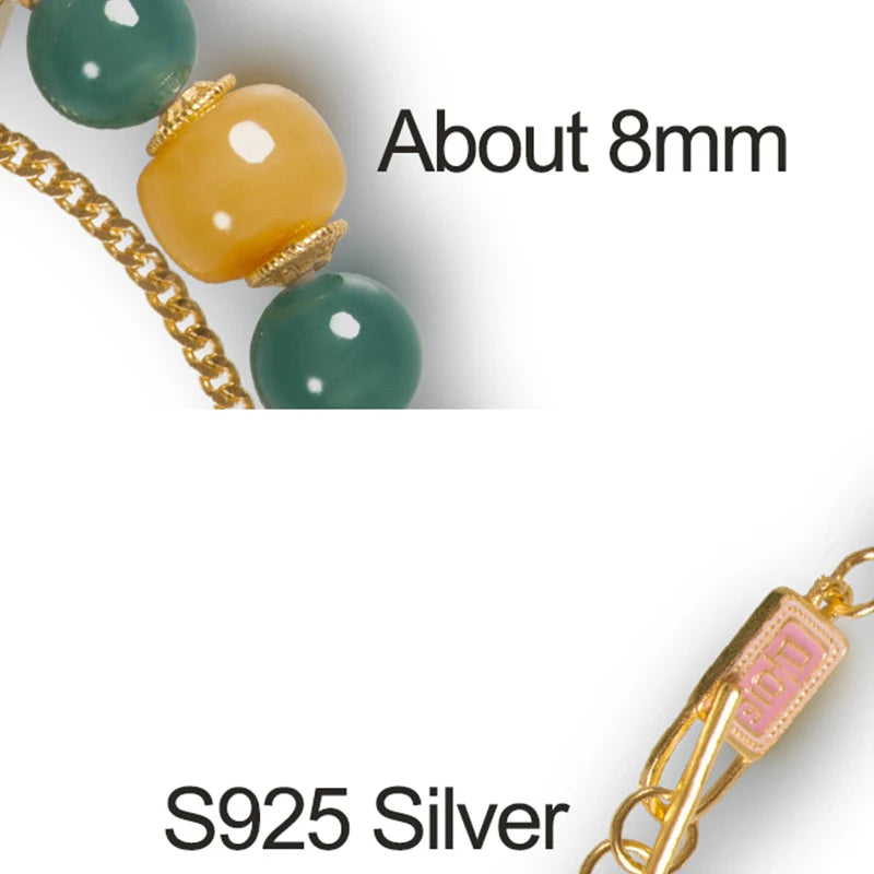 This bracelet is crafted from chicken-oil yellow amber round beads, each bead polished to reveal a soft, oil-like glow that seems to hold light within. Between these warm beads sits a delicate blue jade leaf inlay, a small emblem of growth and gentleness. Together they form a simple circle that is at once fashion and talisman, suitable for young women who love vintage, bohemian, or quietly bold styles.