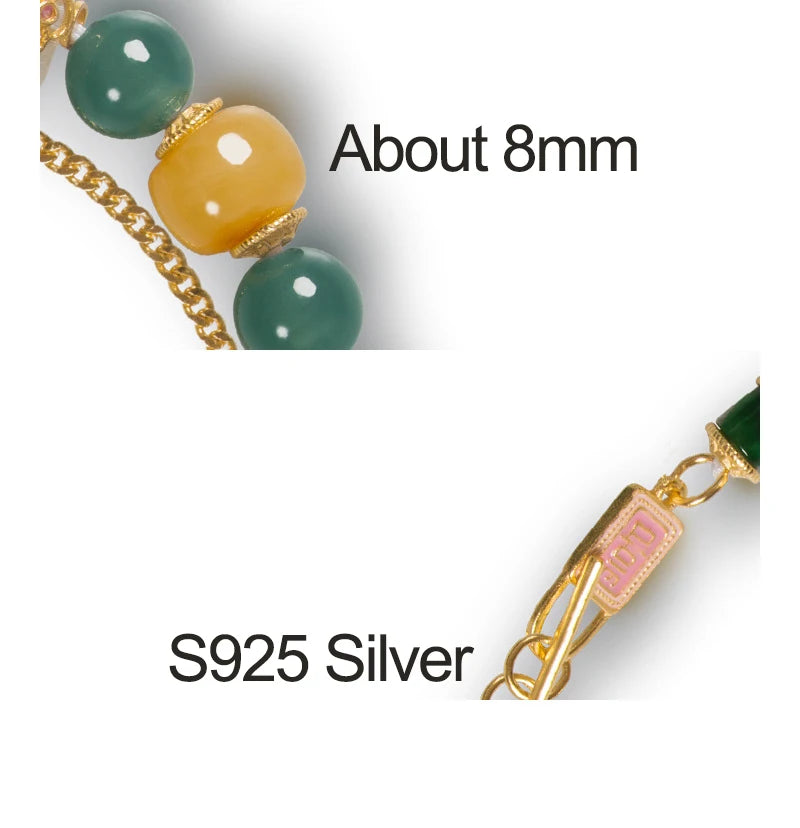 Material and design: the beads are natural amber with a pronounced chicken-oil hue, known for its warm, honeyed translucence. Small blue Hetian-jade leaf inlays are set into select beads, offering a cool visual balance to the amber warmth. Lightweight aluminium-alloy spacers are chosen to preserve the bracelet's comfort while enhancing an ethnic-punk aesthetic. The elastic stringing removes the need for a clasp and allows the bracelet to sit gently on the wrist.