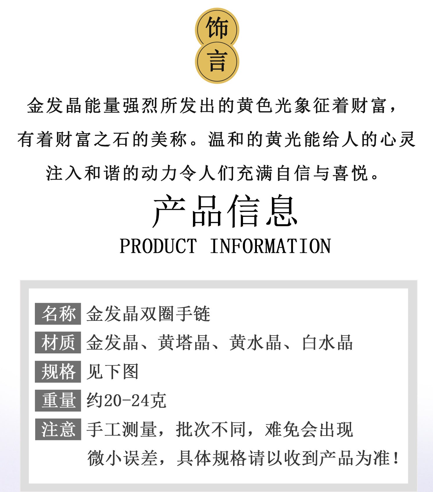 From a feng shui perspective, Golden Rutilated Quartz is a powerful wealth magnet, often placed in the southeast corner of a home to attract prosperity. Worn as a bracelet, it creates a protective aura, deflecting negative chi while drawing in auspicious opportunities. The double circles form a continuous loop, symbolizing unbroken luck and the flow of positive energy. As the old saying goes, "Where intention goes, energy flows"—this piece amplifies your desires, turning wishes into reality.