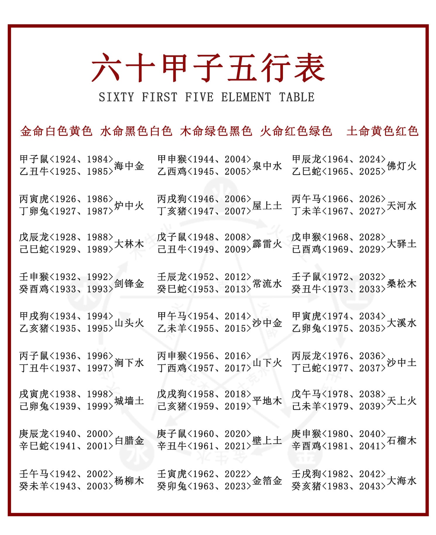 | Elements | Gold, Wood, Water, Fire, Earth |
