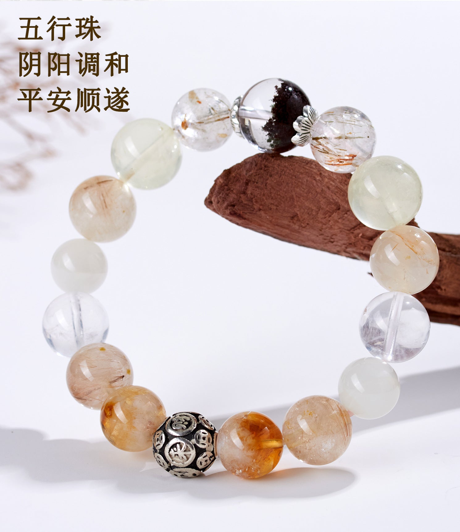 Each element in this bracelet corresponds to a aspect of life: gold for wealth and clarity, wood for growth and vitality, water for fluidity and wisdom, fire for passion and energy, and earth for stability and grounding. The natural crystals, with their innate purity, act as conduits for these energies, helping to align your inner world with the universal flow.