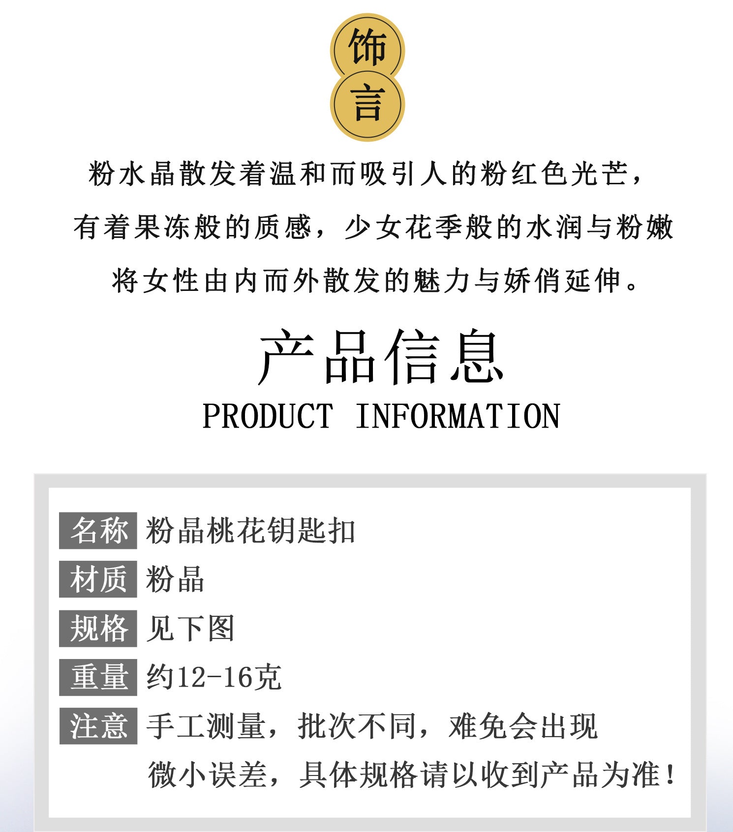 Feng shui wisdom holds that peach blossoms activate the romance sector (Kun position) in one's environment. This keychain, when attached to bags or keys, acts as a portable enhancer, drawing in auspicious chi for relationships and social harmony. In folk traditions, pink quartz is believed to ward off negativity and attract loyal companions. Remember, though, that true fortune stems from a pure heart—this keychain amplifies your innate goodness, guiding you toward meaningful interactions.