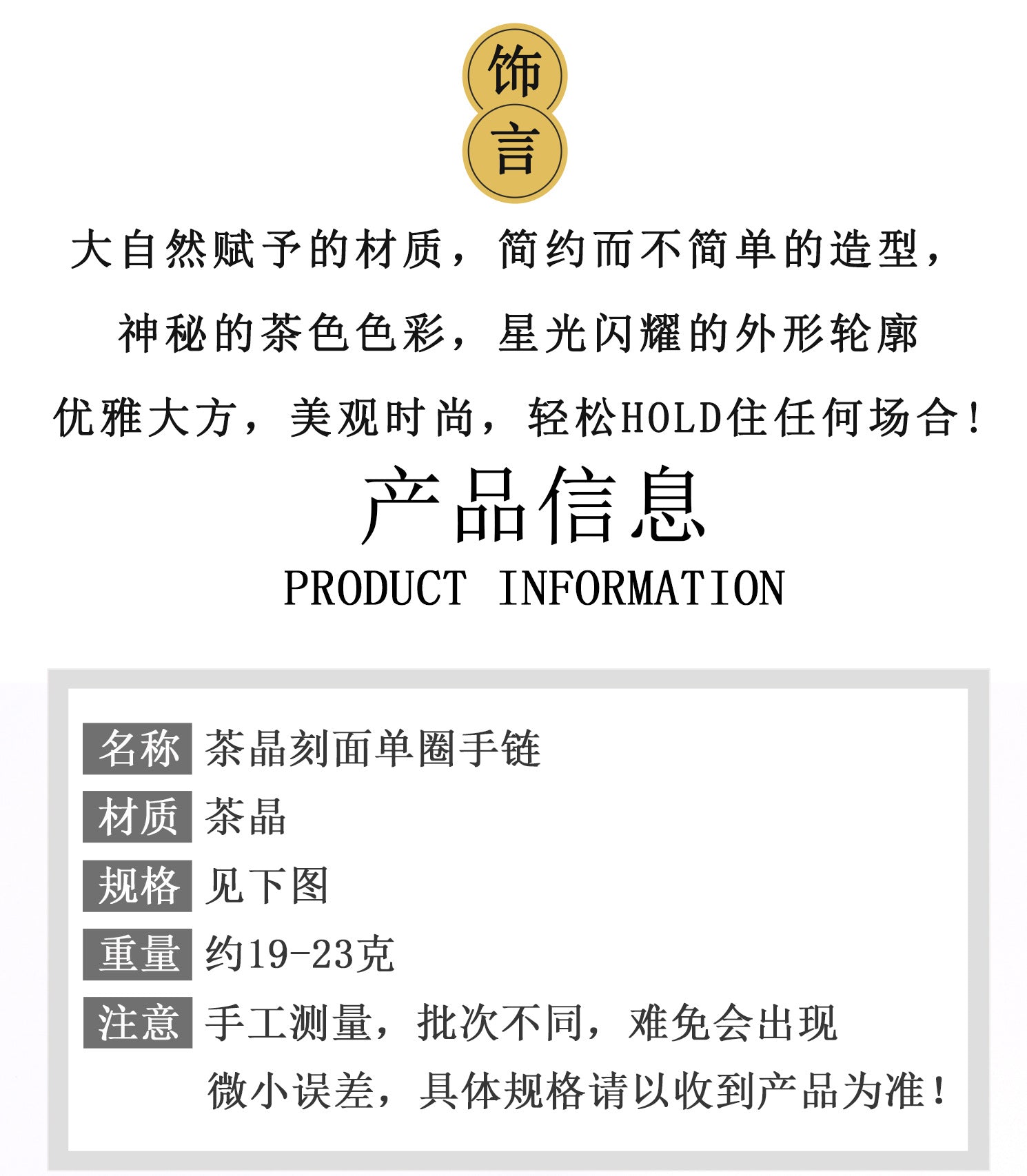 From a feng shui perspective, tea crystal absorbs negative energy and promotes environmental harmony. Worn on the left wrist, it draws in beneficial energy for luck and protection; on the right, it may help release emotional blockages. The single loop signifies continuity and resilience, inspiring growth and perseverance.