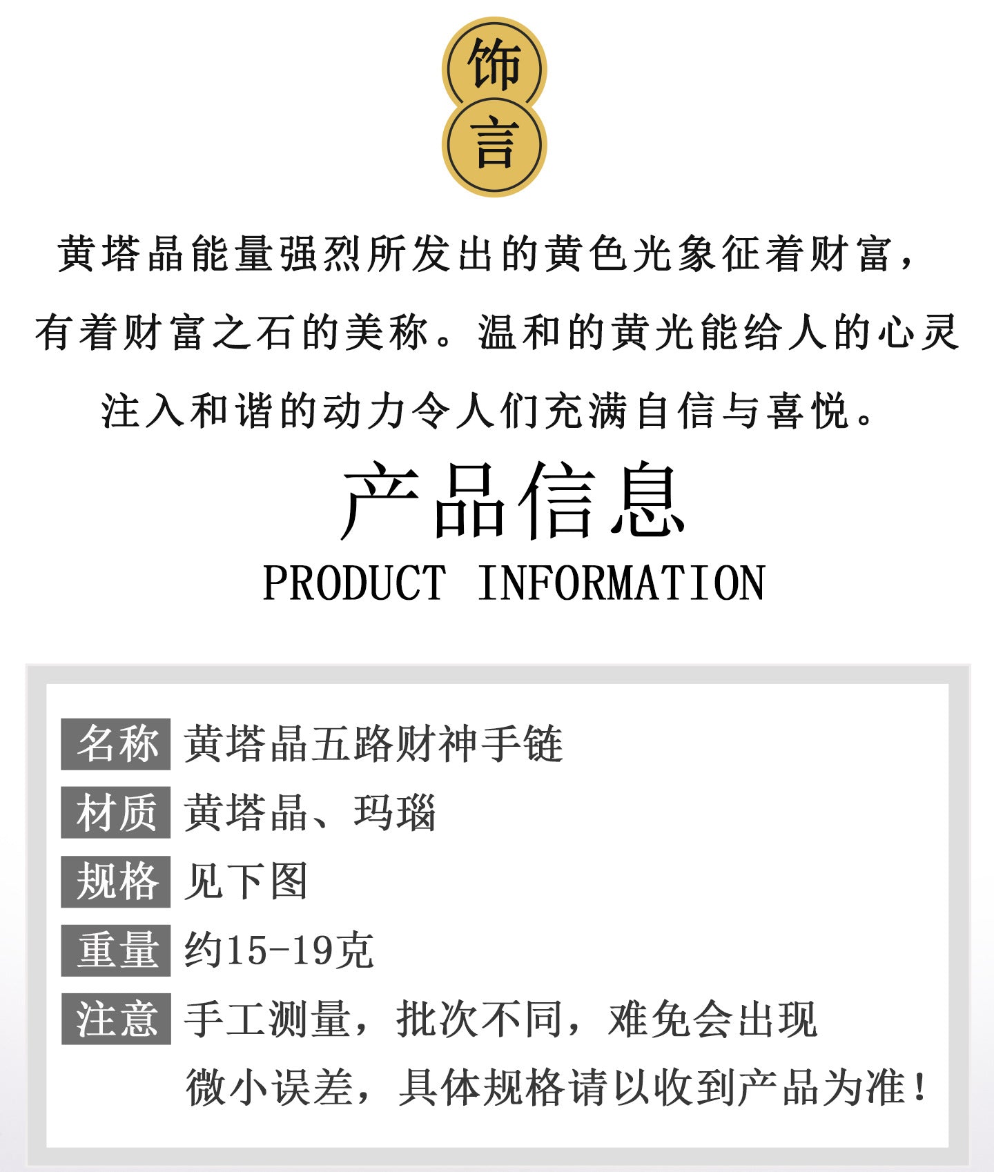 In the ancient wisdom of the I Ching, wealth is described as the harmonious flow of cosmic energy, where "Heaven creates, and earth receives". This Yellow Pagoda Crystal bracelet, adorned with the Five-Way Wealth God, embodies this principle. The natural crystals, sourced from the depths of the earth, carry the essence of the sun's golden light, symbolizing the fire element in Feng Shui—igniting opportunities and dispelling financial obstacles.