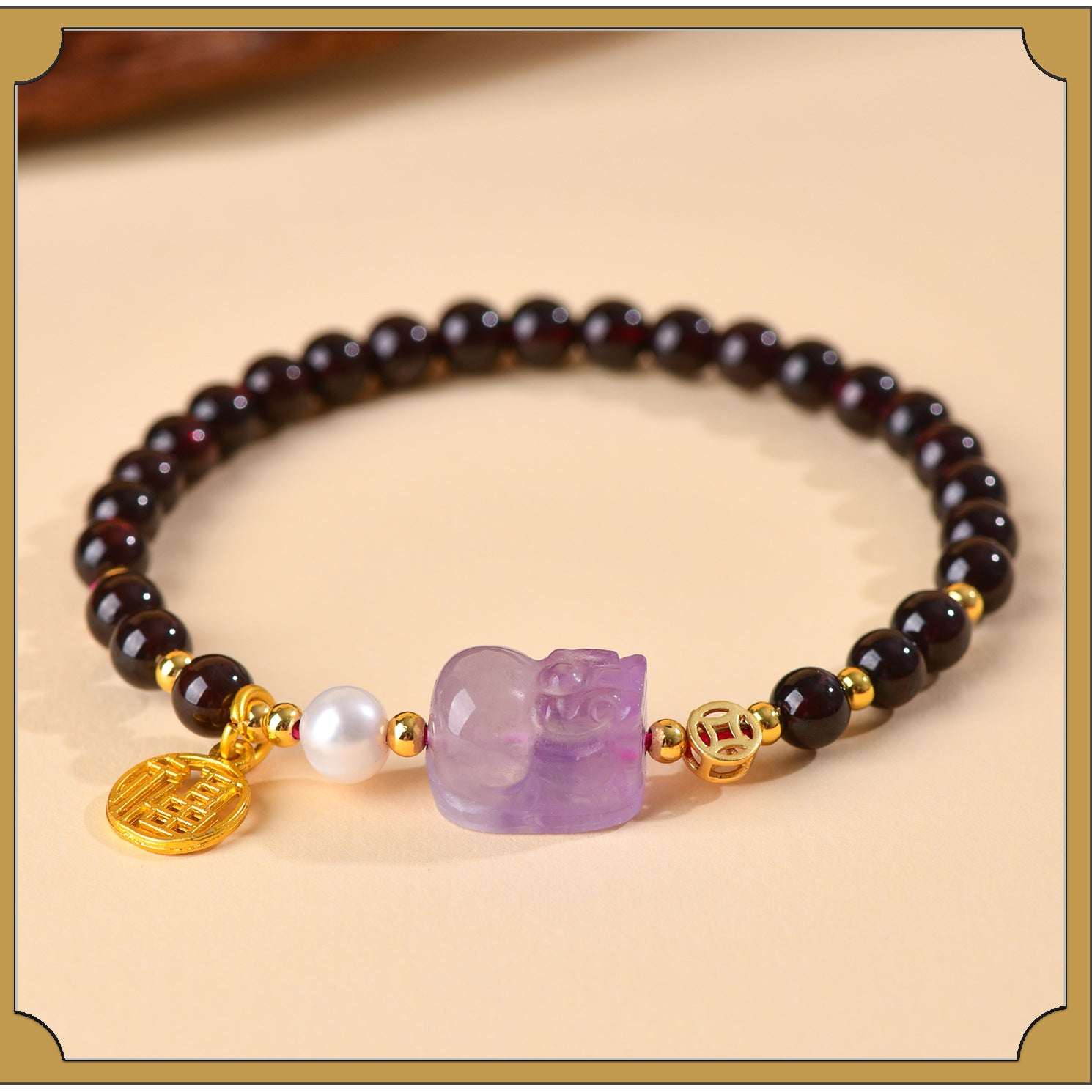 Garnet, known as the "Stone of Commitment," has been cherished since antiquity for its ability to ignite inner strength and protect against negativity. In Taoist philosophy, it represents the unyielding fire element, aligning with the concept of yang energy that drives action and success. When paired with the Pixiu—a mythical creature from Chinese mythology famed for devouring treasures without release—this bracelet becomes a dynamic symbol of wealth attraction. As legends recount, Pixiu guards against financial loss and draws abundance, making it a favored emblem in feng shui practices for home and personal adornment.