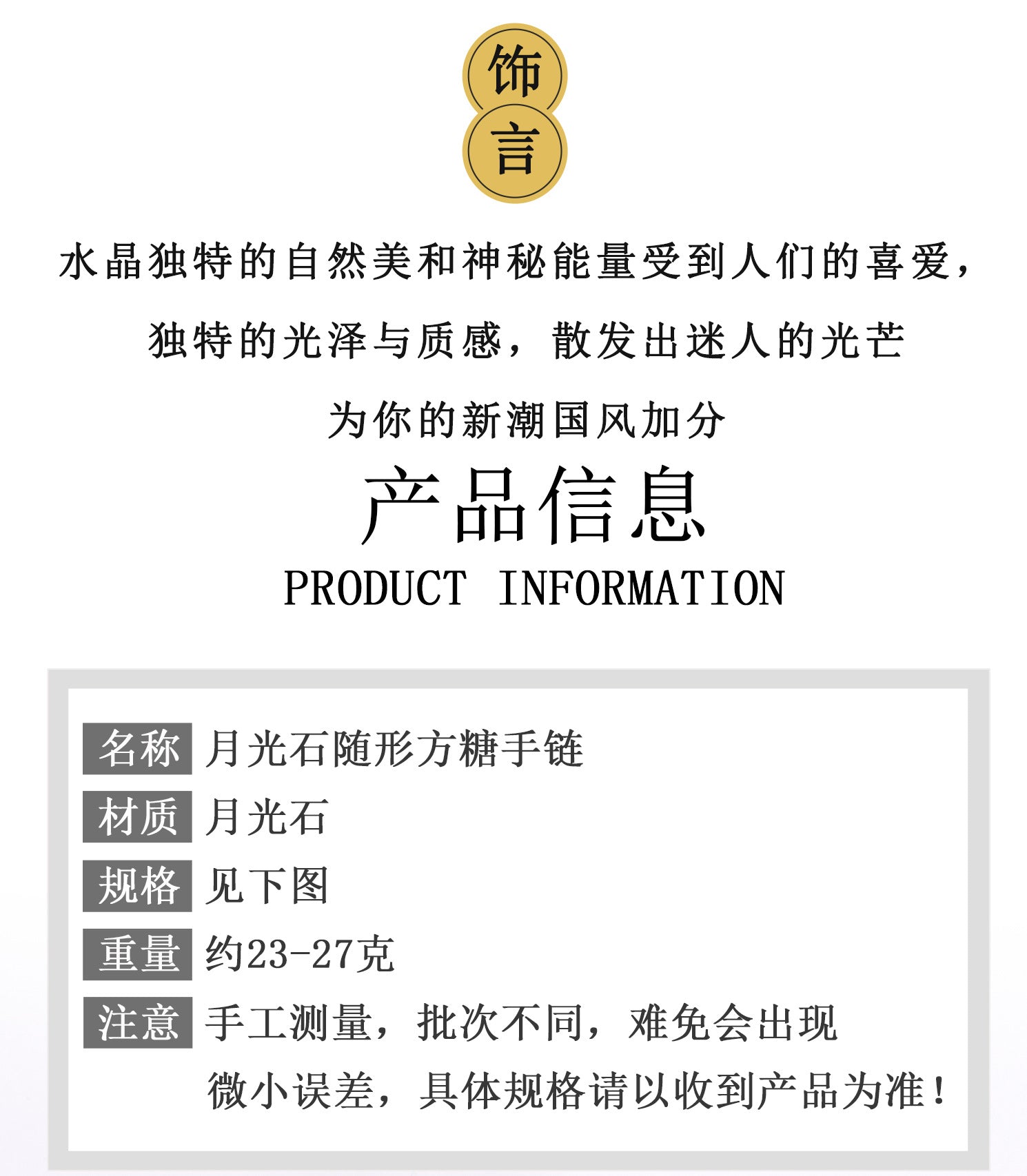 Historically, moonstone was used in various cultures for its links to lunar deities, promoting prophetic dreams and emotional healing. In Chinese tradition, gray stones are associated with the metal element, which governs clarity and organization. This bracelet's sugar cube-like beads draw inspiration from the idea that life's sweetness comes in diverse forms, encouraging the wearer to celebrate uniqueness and resilience.