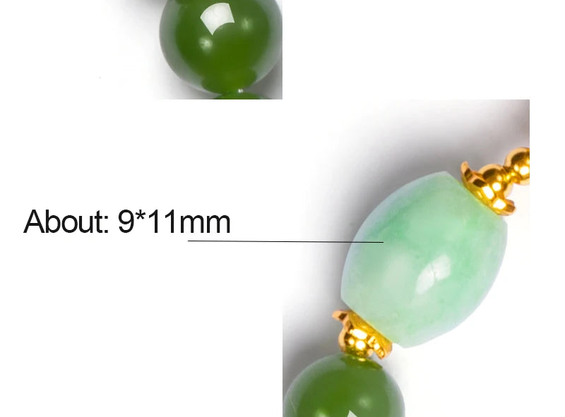 Close-up of hand-selected Hetian jasper beads showcasing unique veining and earthy tones. Each bead varies naturally, ensuring a one-of-a-kind piece.