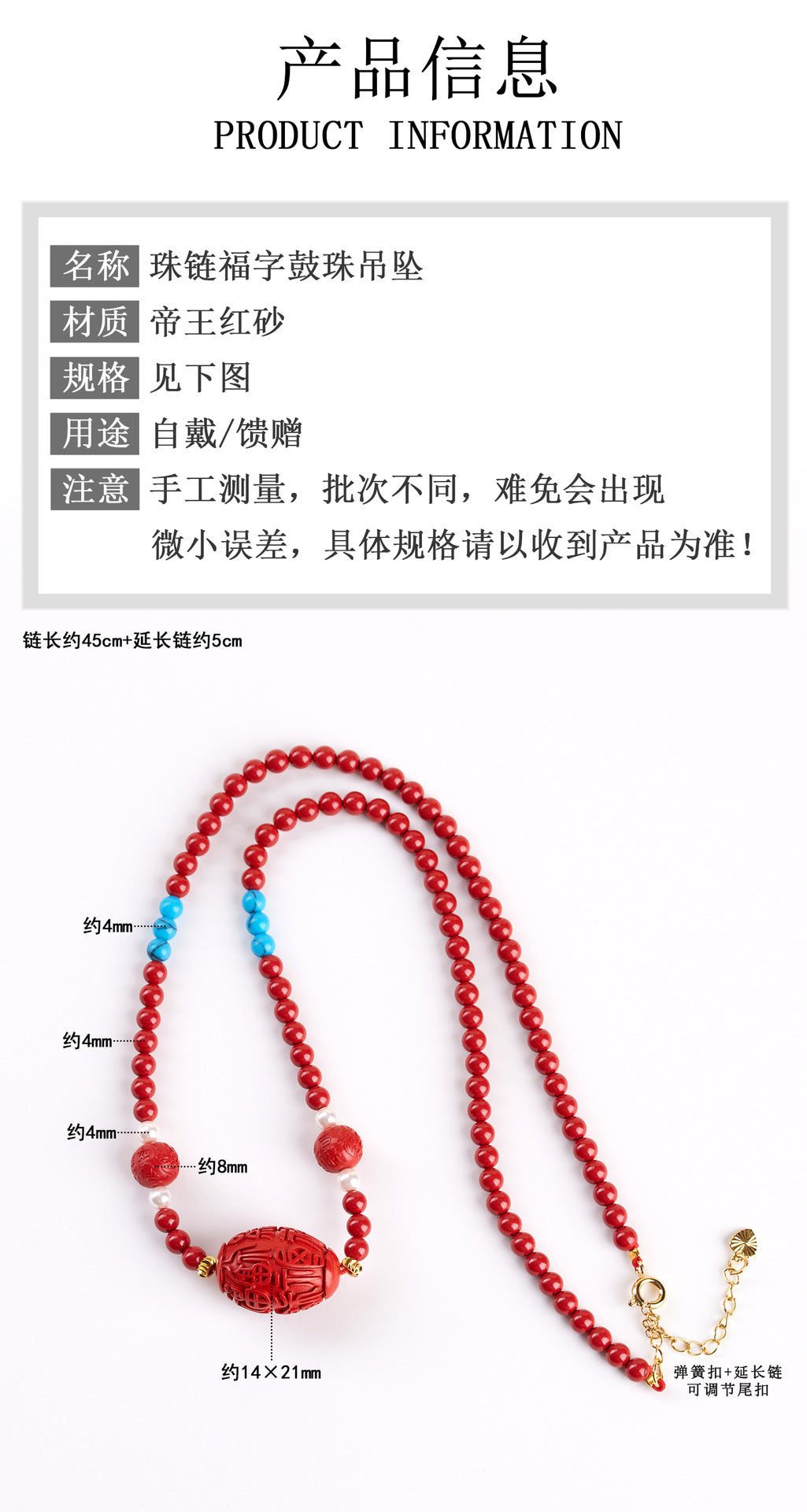 Here, cinnabar embodies the fiery essence of heaven, while the earth is represented in the sturdy drum bead pendant. Worn as a collarbone chain, it harmonizes the wearer's energy with the cosmic flow, fostering balance and inviting prosperity. The Fu character, etched into the pendant, resonates with this unity—a symbol of blessings that descend like gentle rain, nourishing the soul.