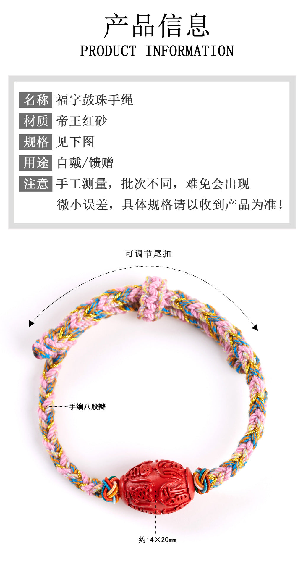 In Buddhist traditions, cinnabar is often associated with mindfulness and compassion. Wearing this bracelet can aid in meditation, helping to calm the mind and cultivate inner serenity. From a feng shui perspective, the red color activates the fire element, which is linked to fame and reputation, while the drum beads symbolize the rhythmic cycles of life, attracting good fortune and warding off negativity. The rope's flexibility allows for adjustable wear, adapting to the wearer's energy and intentions.