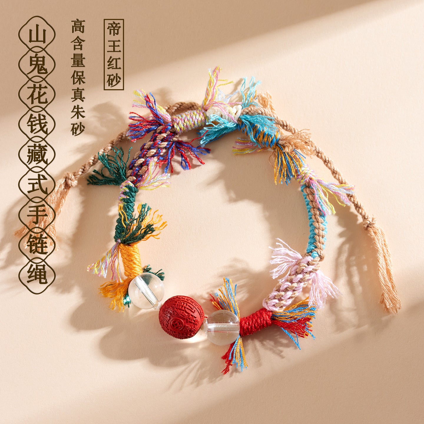Cinnabar, with its fiery essence, represents the yang principle—active, protective, and life-affirming. When paired with the earthy Tibetan rope and floral motifs, it creates a synergy that stabilizes one's aura. Each twist of the rope echoes the eternal cycles of nature, while the Mountain Ghost Flower symbolizes resilience and hidden blessings, much like the unpredictable yet benevolent forces described in Daoist lore.