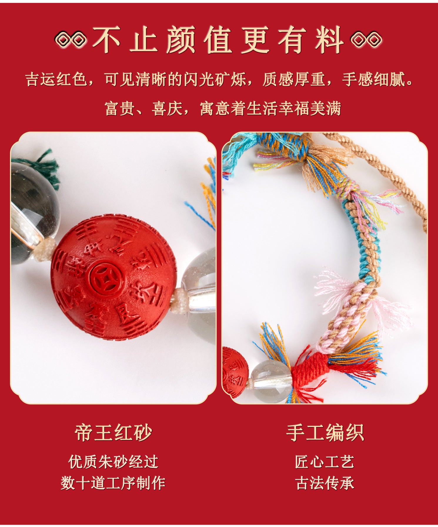 Featuring high-content natural cinnabar beads, known for their protective properties and vibrant color that symbolizes vitality and fortune.