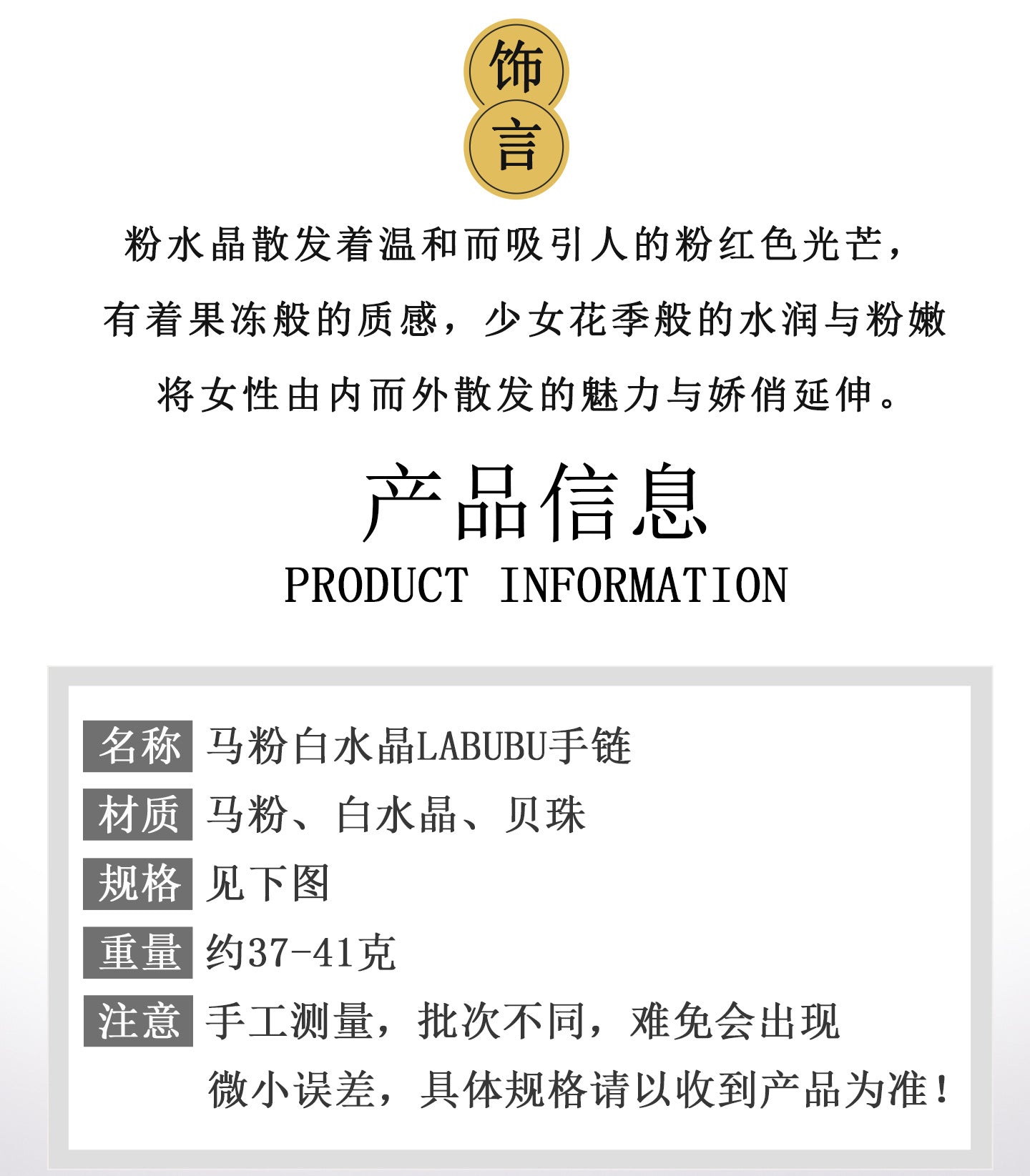 Here, the gentle pink energy acts as the wind, soothing the heart, and the white crystals embody the fire, illuminating one's path. Wearing this bracelet aligns with the principle of yin and yang—softness and strength intertwined. The LABUBU charm, with its whimsical design, serves as a guardian, reminding us to embrace joy and ward off negativity.