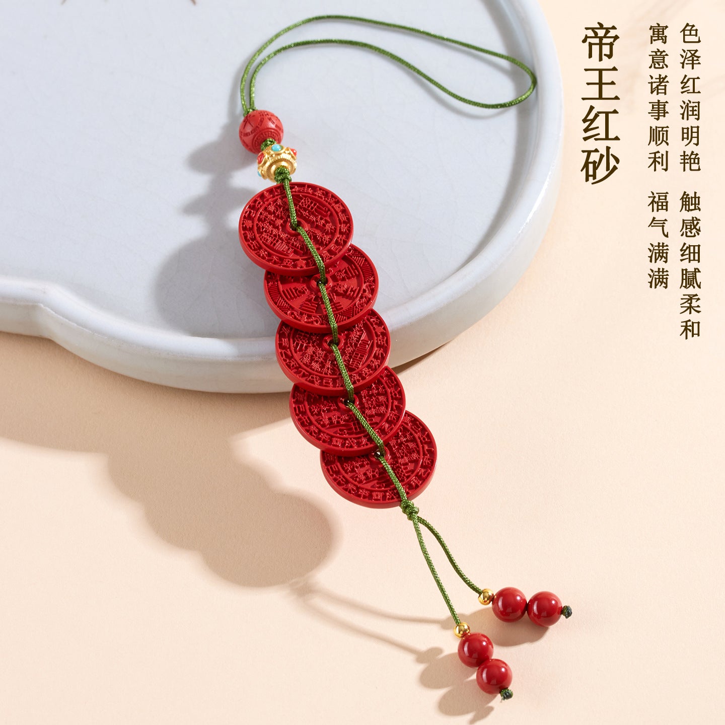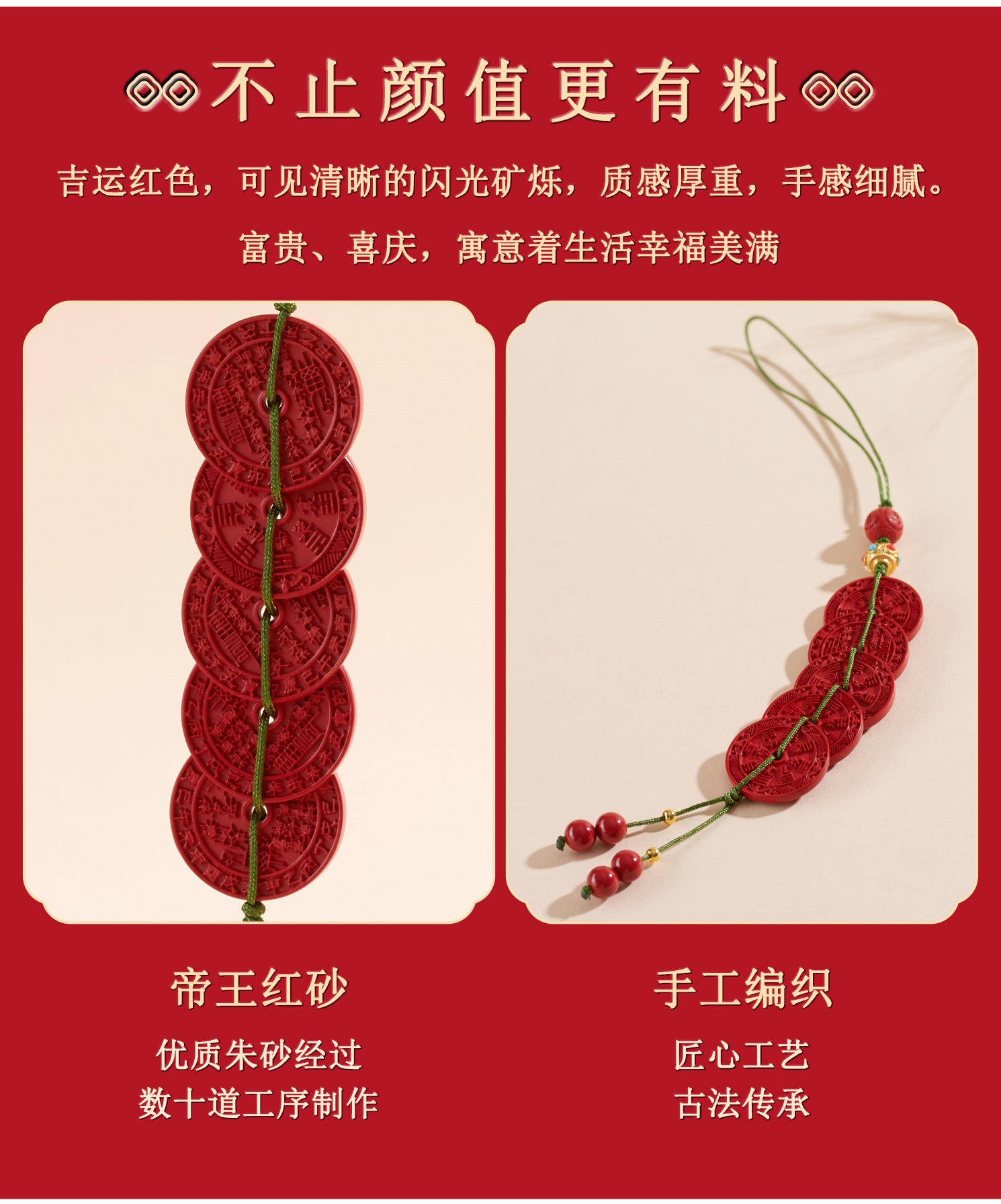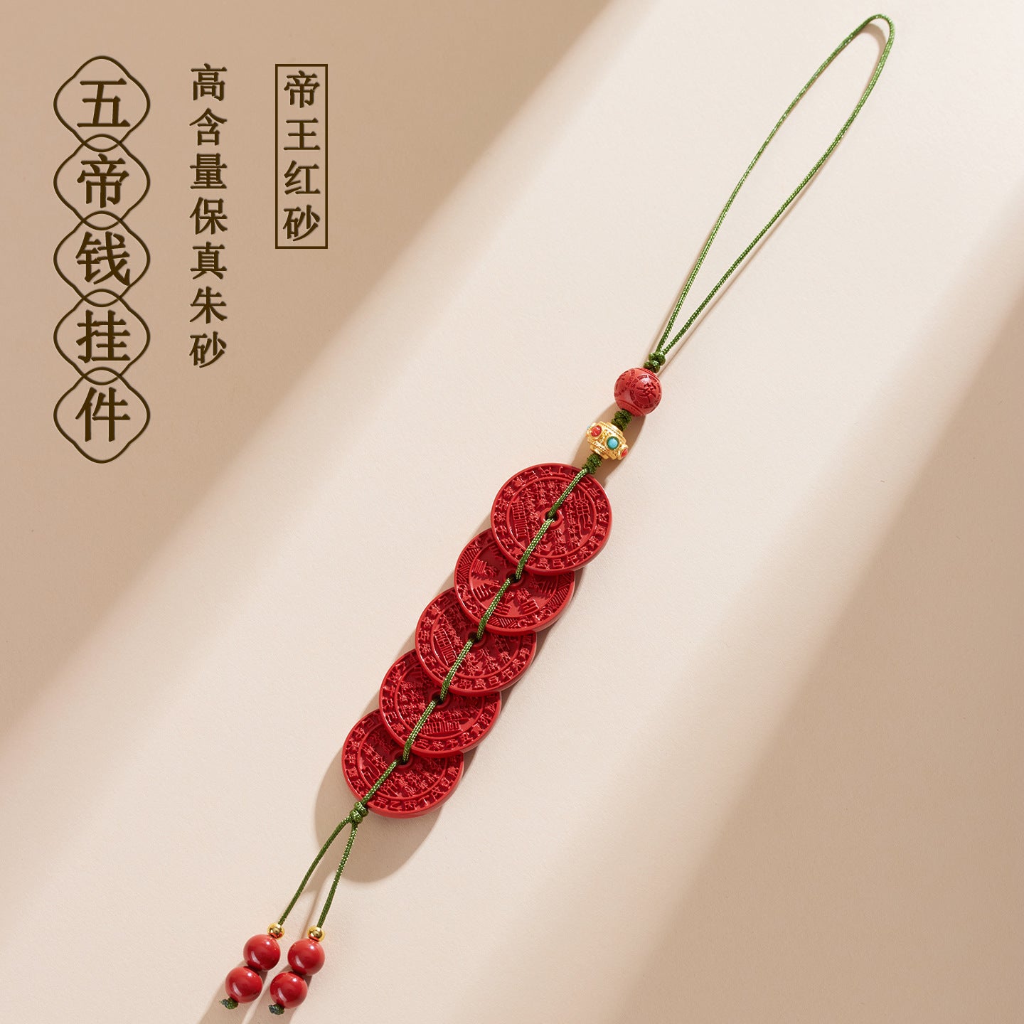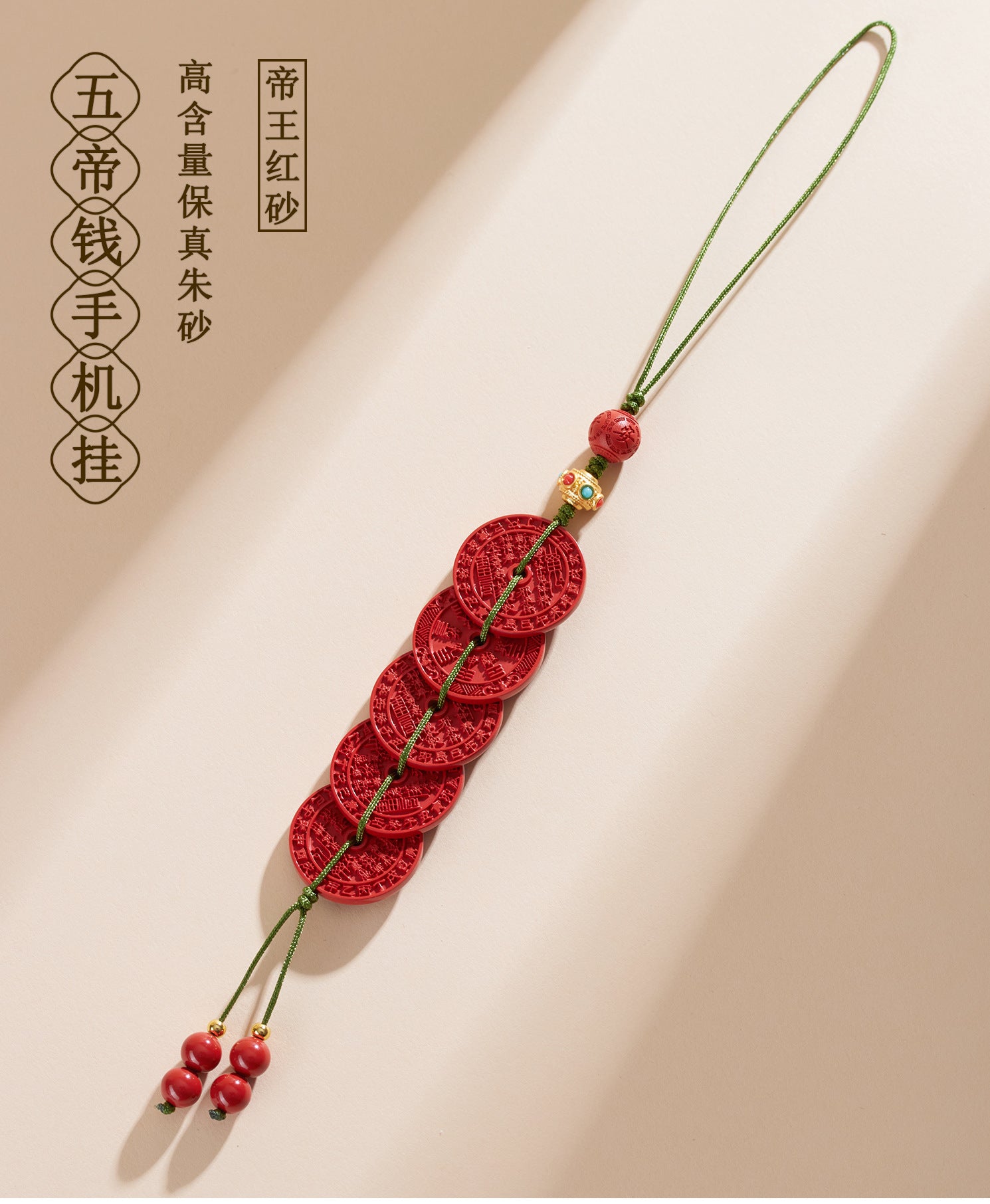 Here, the cinnabar's vibrant red represents the fire element, igniting passion and drive, while the Five Emperors Coin—a symbol of historical emperors—anchors earthly authority. Together, they create a harmony of elements, guiding the wearer toward success and stability. As the classic text suggests, aligning with natural cycles brings boundless opportunities.