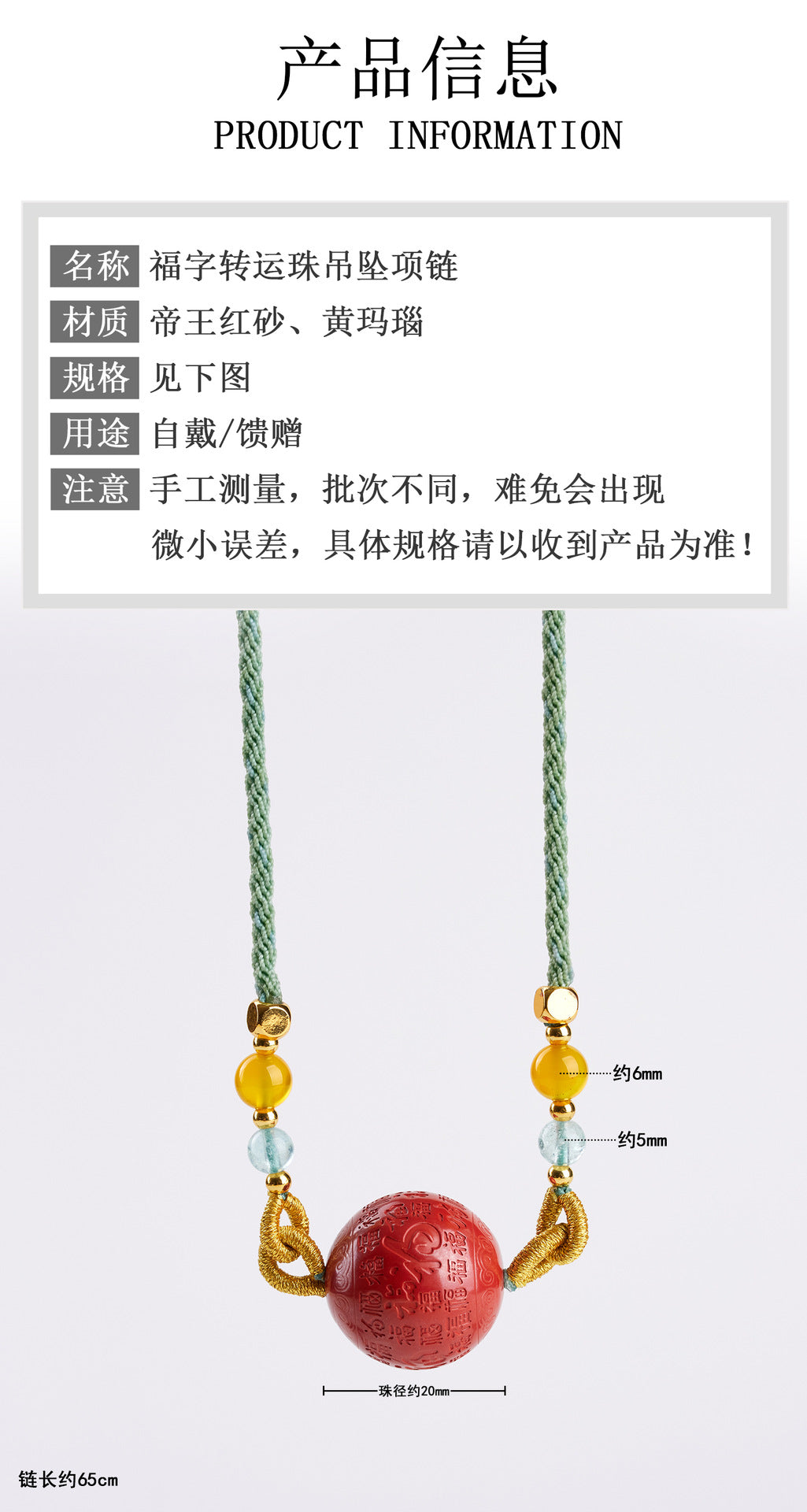 This principle aligns with cinnabar's vibrant nature, encouraging perseverance and positive transformation. Wearing this necklace serves as a reminder to embrace change with courage, much like the ever-turning cycles of fate. The Fu character, deeply rooted in folk traditions, acts as a talisman to attract abundance and shield against misfortune.