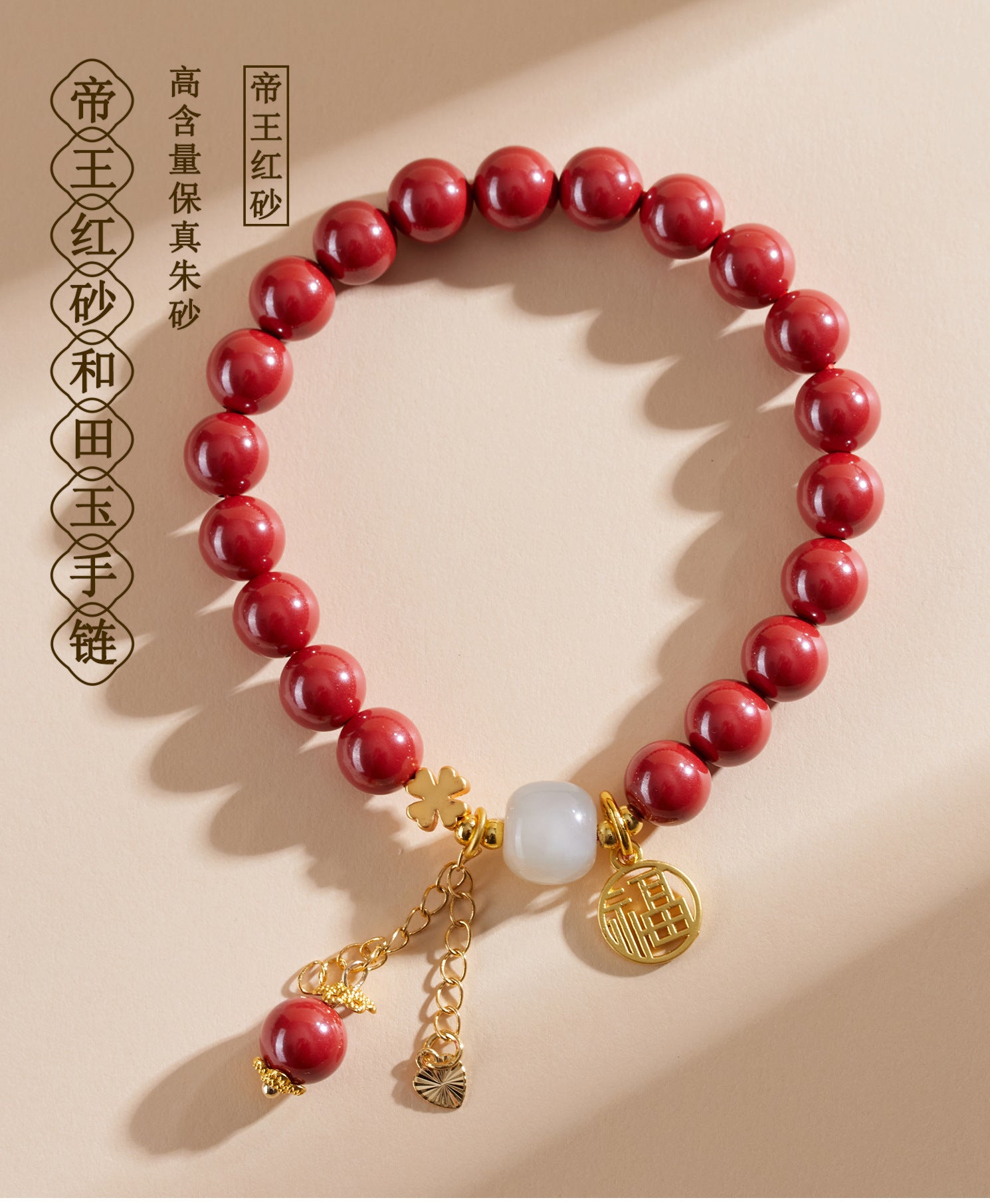This wisdom reflects the bracelet's purpose: to inspire resilience and unwavering spirit in the wearer. The cinnabar's vibrant red symbolizes the fire element, igniting courage and driving away negativity, while the Hetian jade embodies the earth's stability, promoting balance and inner peace. Together, they create a synergy of yin and yang—the fundamental Taoist principle of harmony in opposites.