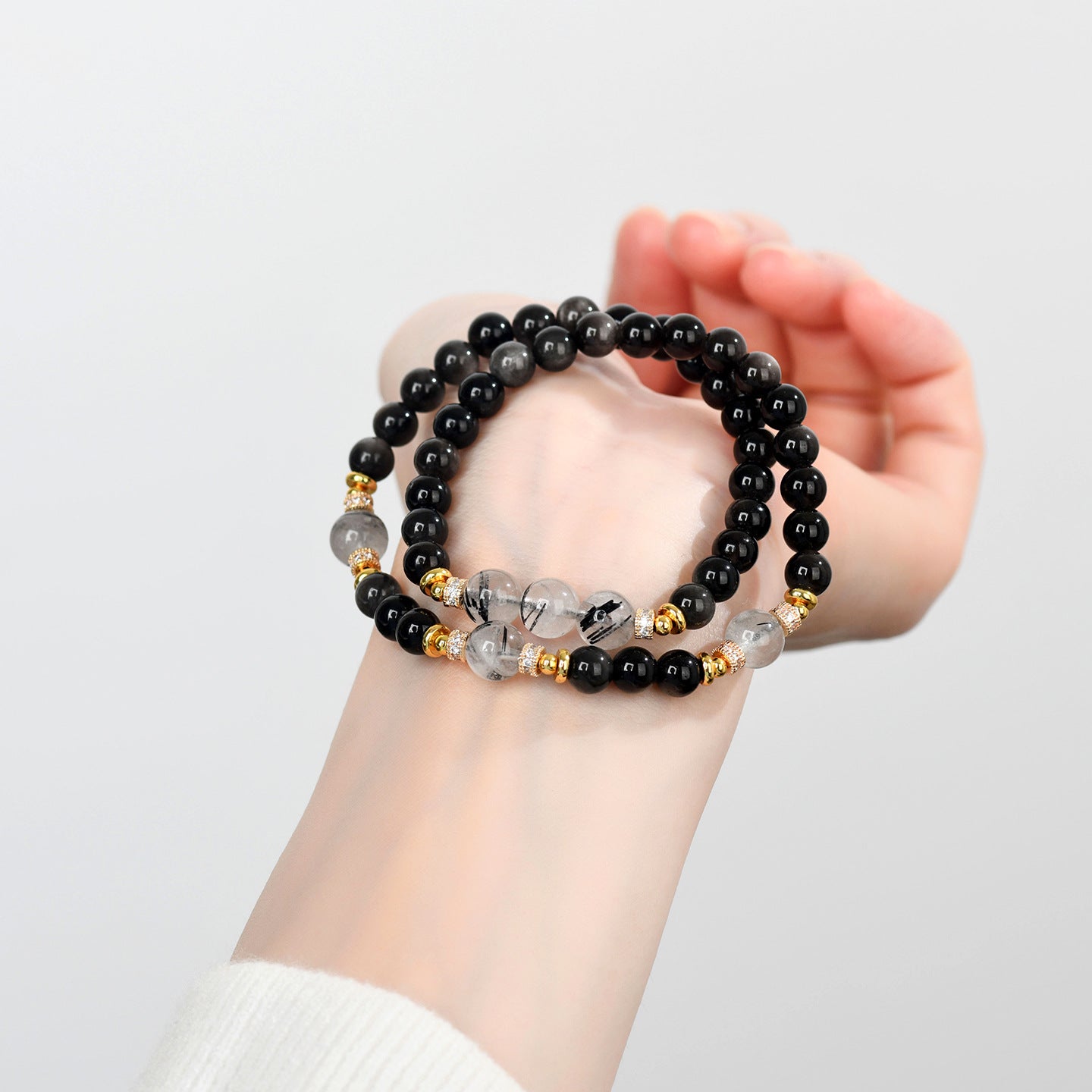In the ancient traditions of spiritual adornments, silver obsidian has been revered as a stone of protection, mirroring the depths of the earth's wisdom, while black rutilated quartz is known as a beacon of clarity, its golden threads symbolizing the light within darkness. This double circle bracelet, inspired by Chinese style, weaves these elements into a tale of balance and transformation. As the I Ching teaches,