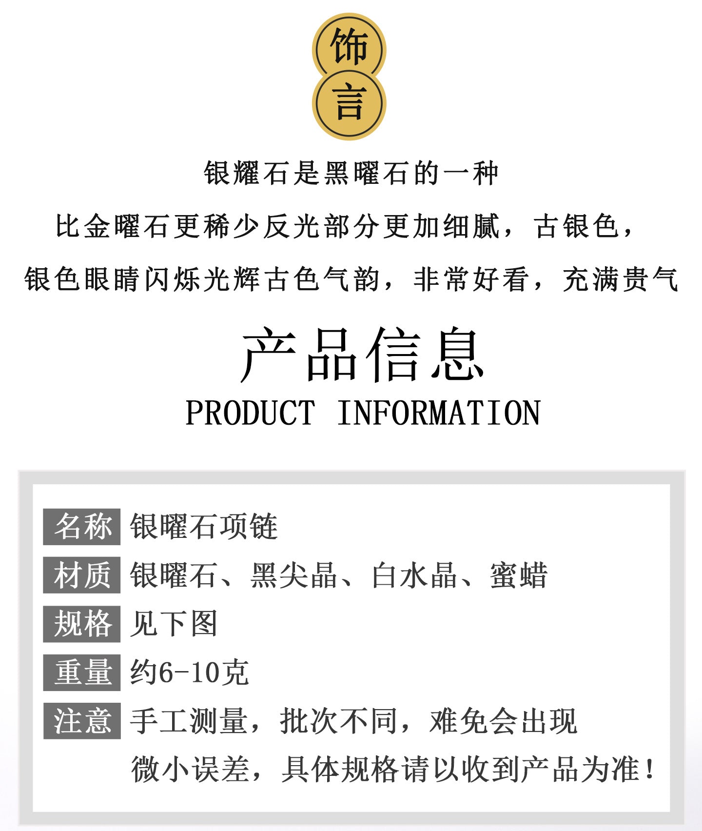 | Material | Natural Silver Obsidian, Black Spinel |
