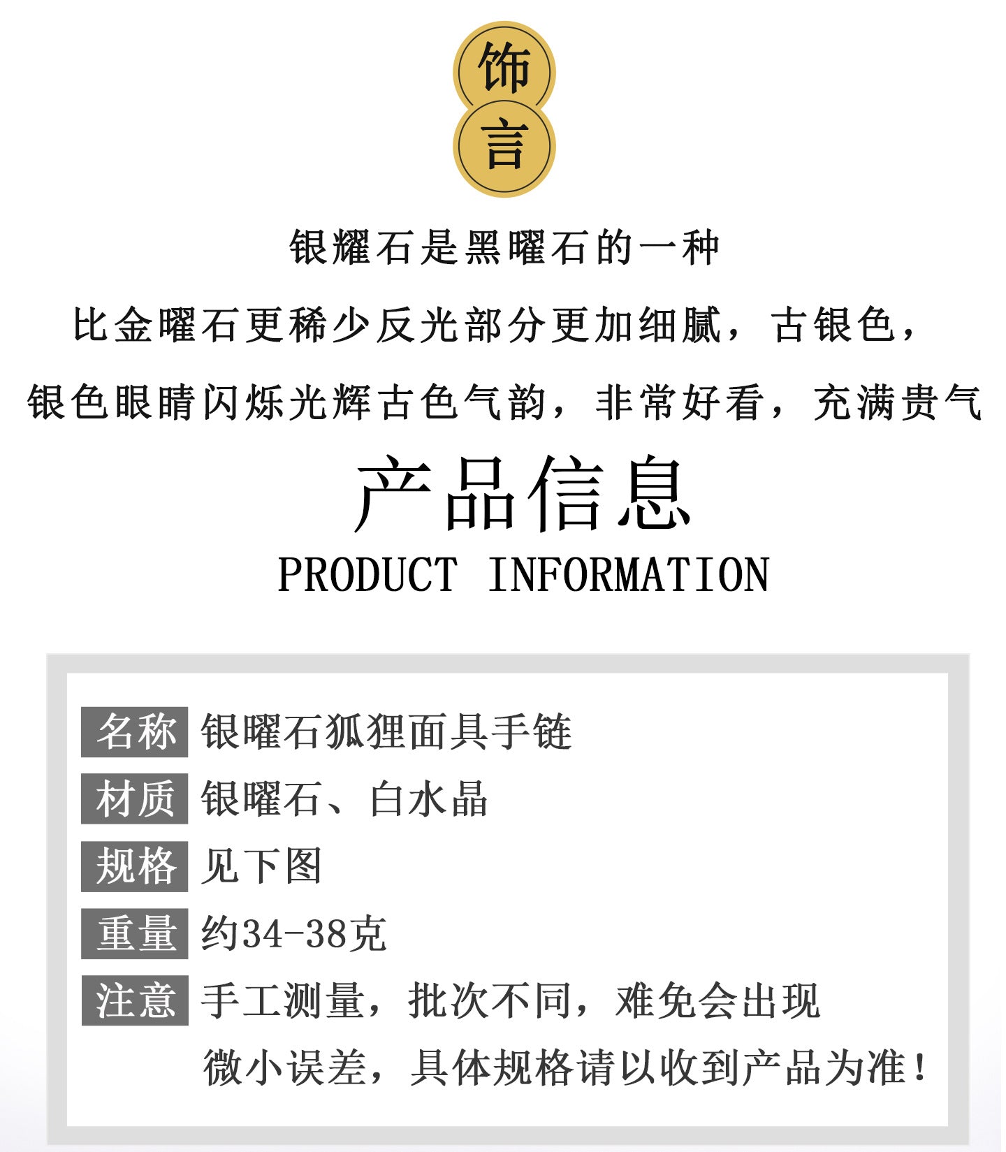 In the realm of ancient wisdom, Silver Obsidian is revered as a stone of protection, mirroring the depths of the earth's hidden mysteries. Known as the "mirror of the soul," it reflects inner truths and wards off negative energies, much like the vigilant fox in folklore, symbolizing cunning and adaptability. This Silver Obsidian Fox Mask Bracelet intertwines with White Crystal, a beacon of purity and clarity, evoking the lion's awakening—a symbol of courage and royal authority in Eastern traditions.