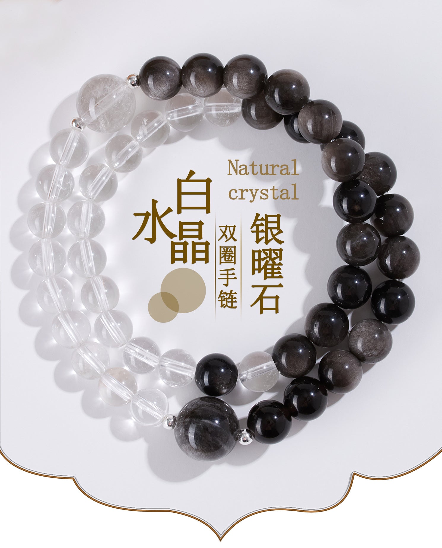 In feng shui, crystals are used to enhance environmental energy. Silver Obsidian is placed in homes for protection, and White Crystal for purification. Worn on the wrist, this bracelet attracts wealth and wards off evil spirits. The double circles symbolize doubled blessings—prosperity and health. Remember, 'Feng shui follows the heart'; a kind intention amplifies its effects.