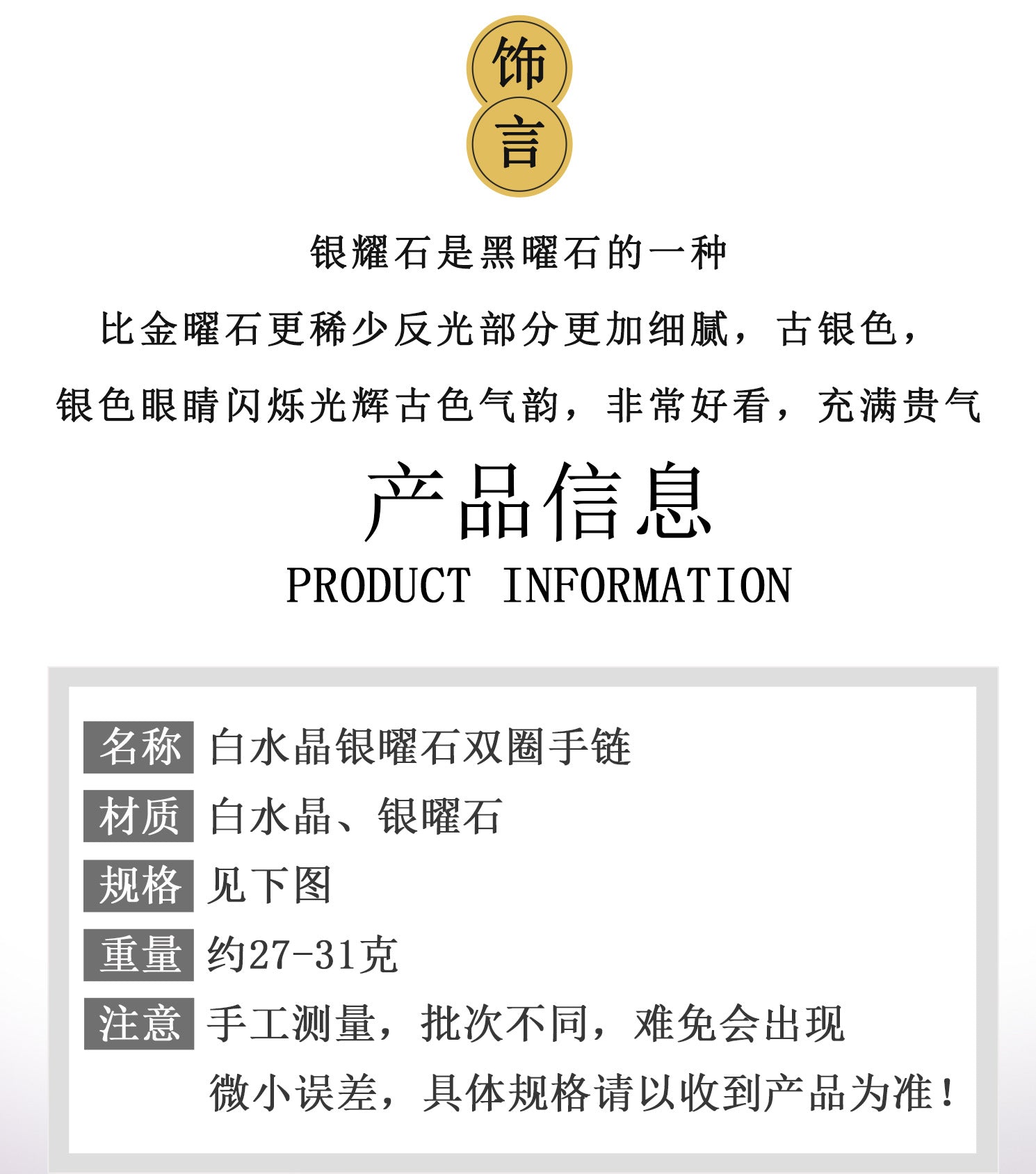 This bracelet embodies this wisdom: Silver Obsidian represents the grounding yin energy, while White Crystal embodies the uplifting yang. The double circle design mirrors the eternal cycle of life, promoting continuous flow of positive chi. Wearing it helps align one's inner energy with the cosmic balance, fostering resilience and peace.