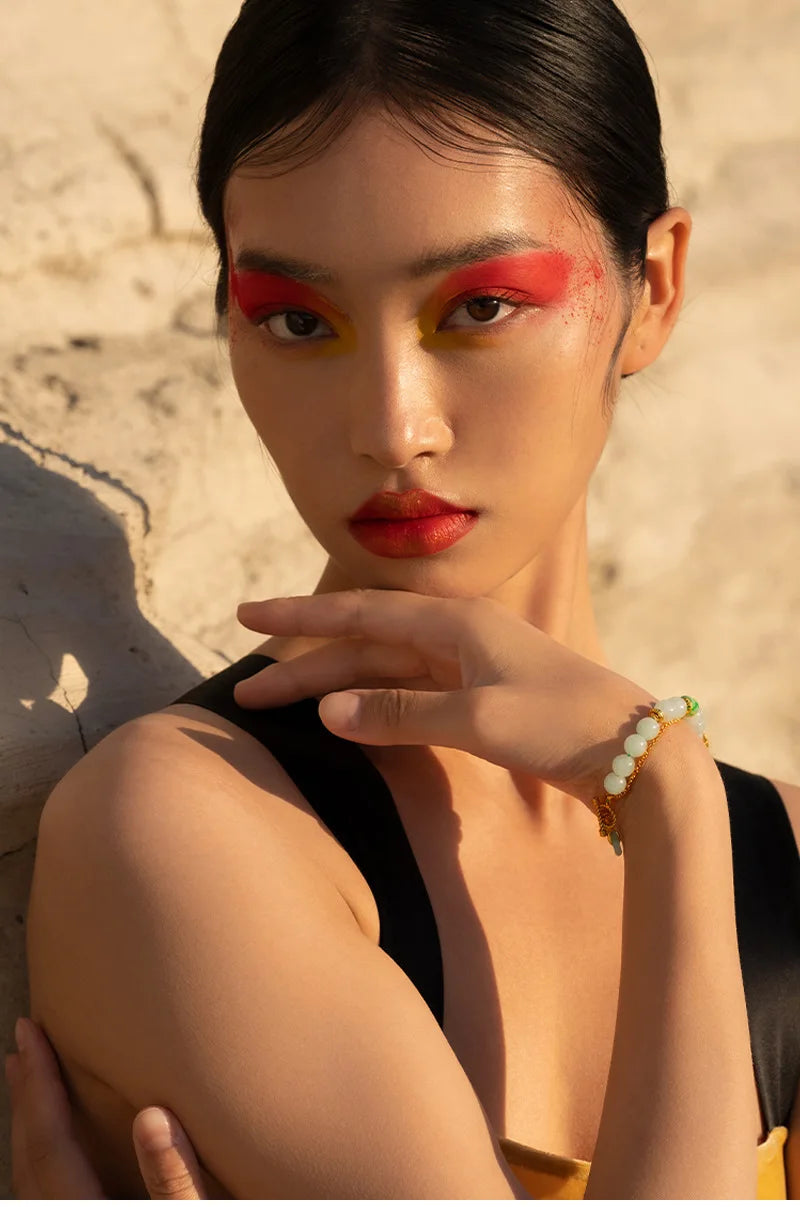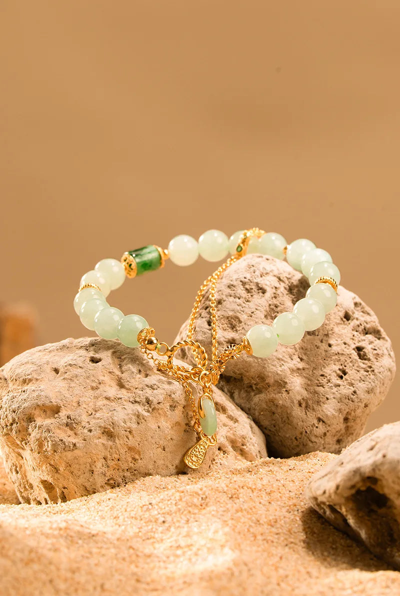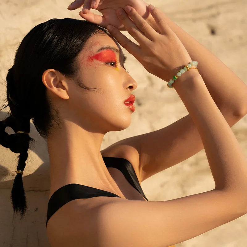 Daoist balance also informs the design. The harmony of hard stone and soft metal reflects yin-yang complementarity: solidity paired with luster, quiet green with sunny gold. The piece reads as a small cosmology worn at the wrist—a reminder that harmony is achieved not by force but by fitting parts into an elegant whole. As the Daoist spirit suggests, the bracelet invites the wearer to move with ease through the day, to let strength be gentle.