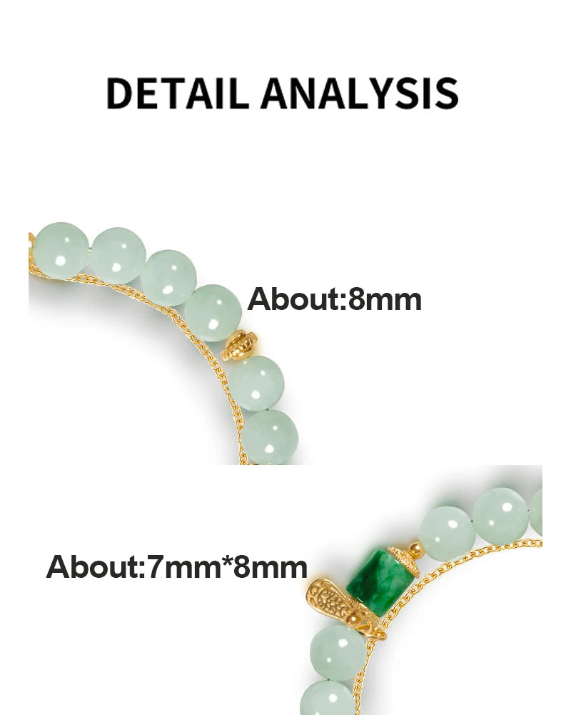 This bracelet is born of two materials that have long been treasured across generations: natural Type A jadeite and sterling silver with a delicate gold plating. In texture and tone the jade beads are cool and smooth, each sphere carrying tiny differences—veins of lighter green, a hint of translucence at the edges—so that no two bracelets are identical. The metalwork is S925 sterling silver, plated with a fine layer of gold to marry warmth with resilience; together they form a piece that is at once elegant, earthy, and intimate.