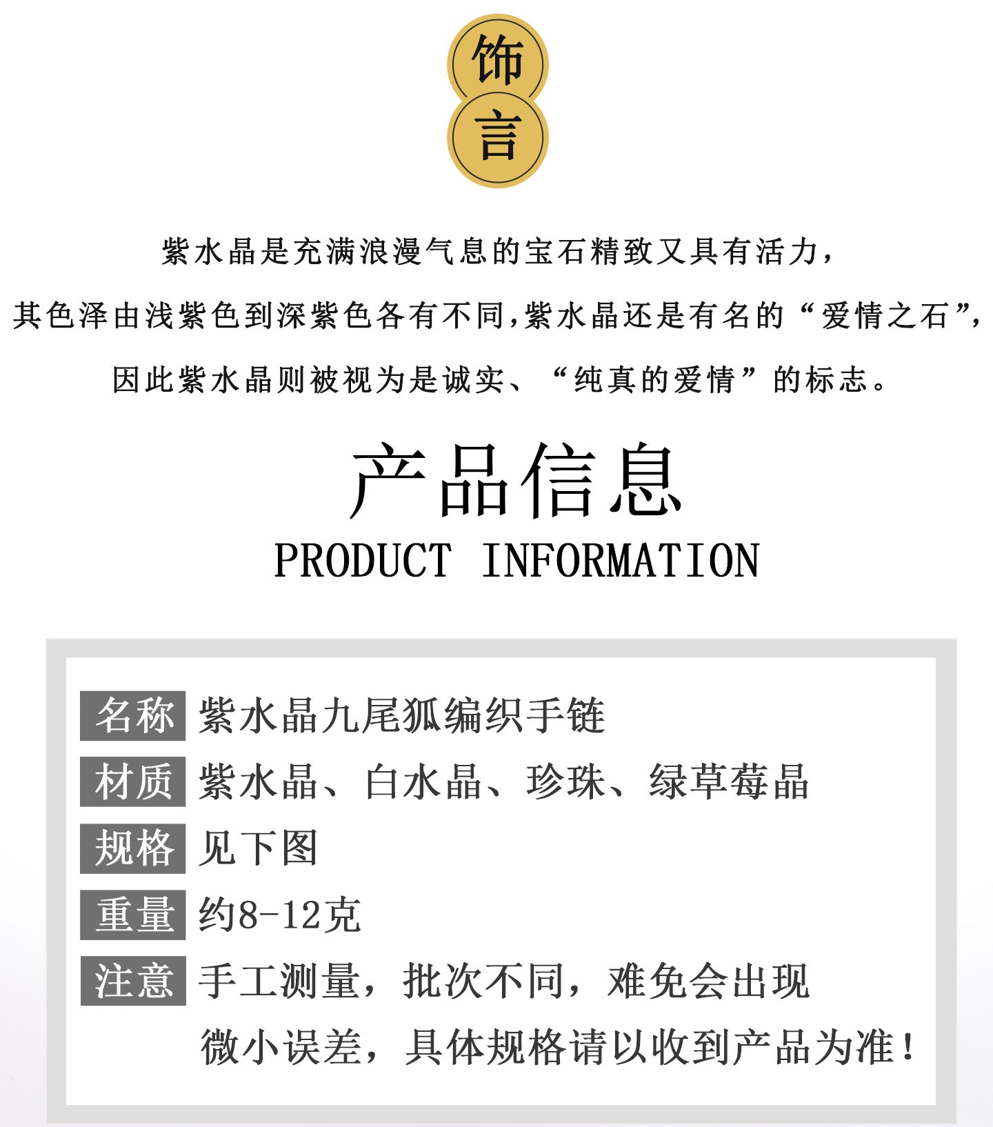 From a Feng Shui perspective, amethyst is believed to enhance spiritual growth and attract abundance, while the nine-tailed fox acts as a guardian against misfortune. Placing it on the left wrist—the receiving side in energy practices—can help draw in positive chi. As the saying goes, "Good fortune follows a pure heart," and this bracelet encourages the cultivation of virtue and mindfulness.