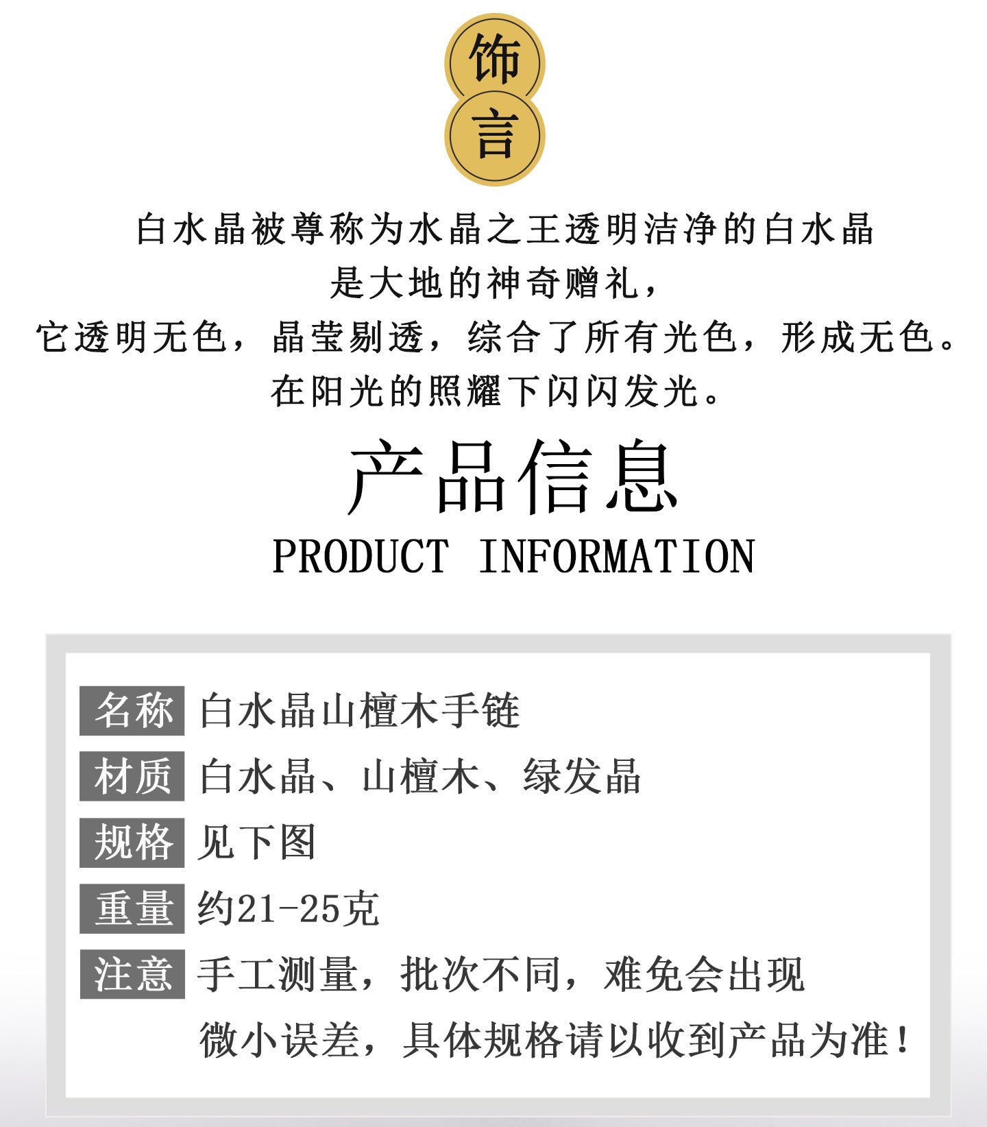 | Material | White Crystal, Sandalwood, Green Rutilated Quartz |