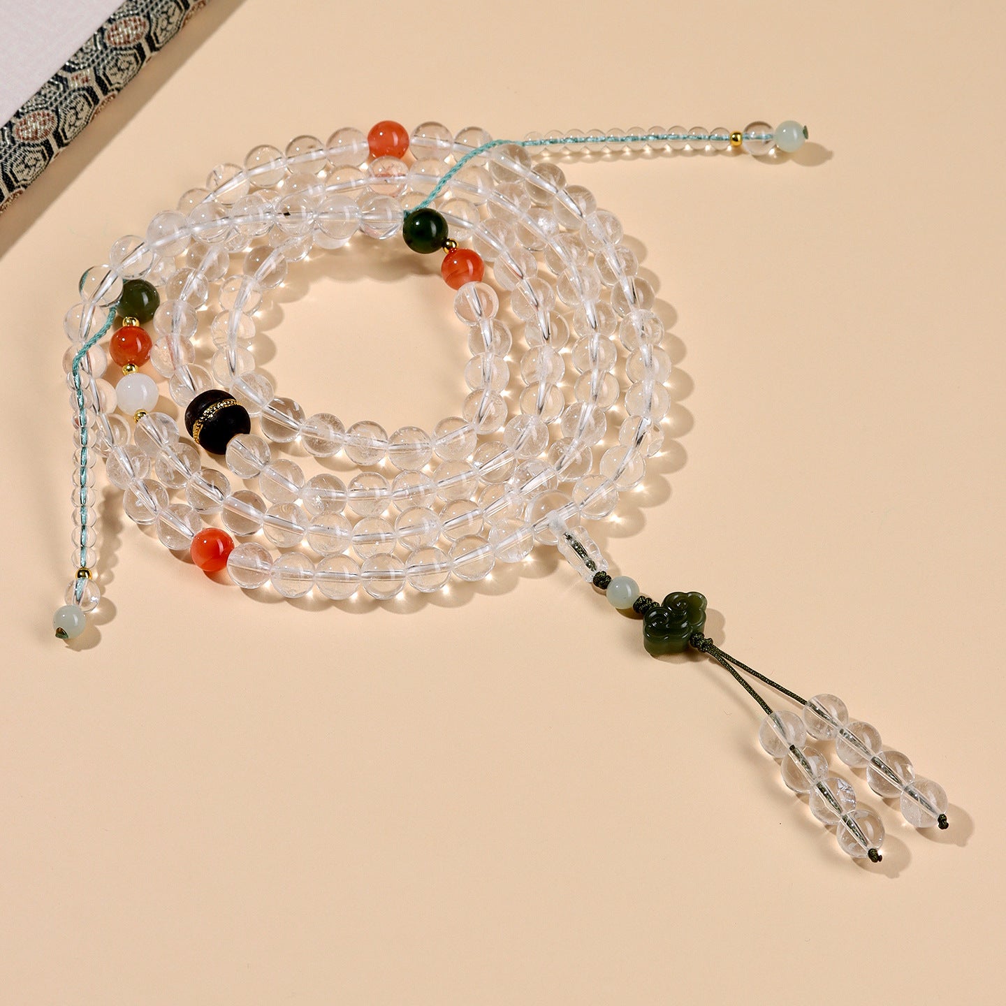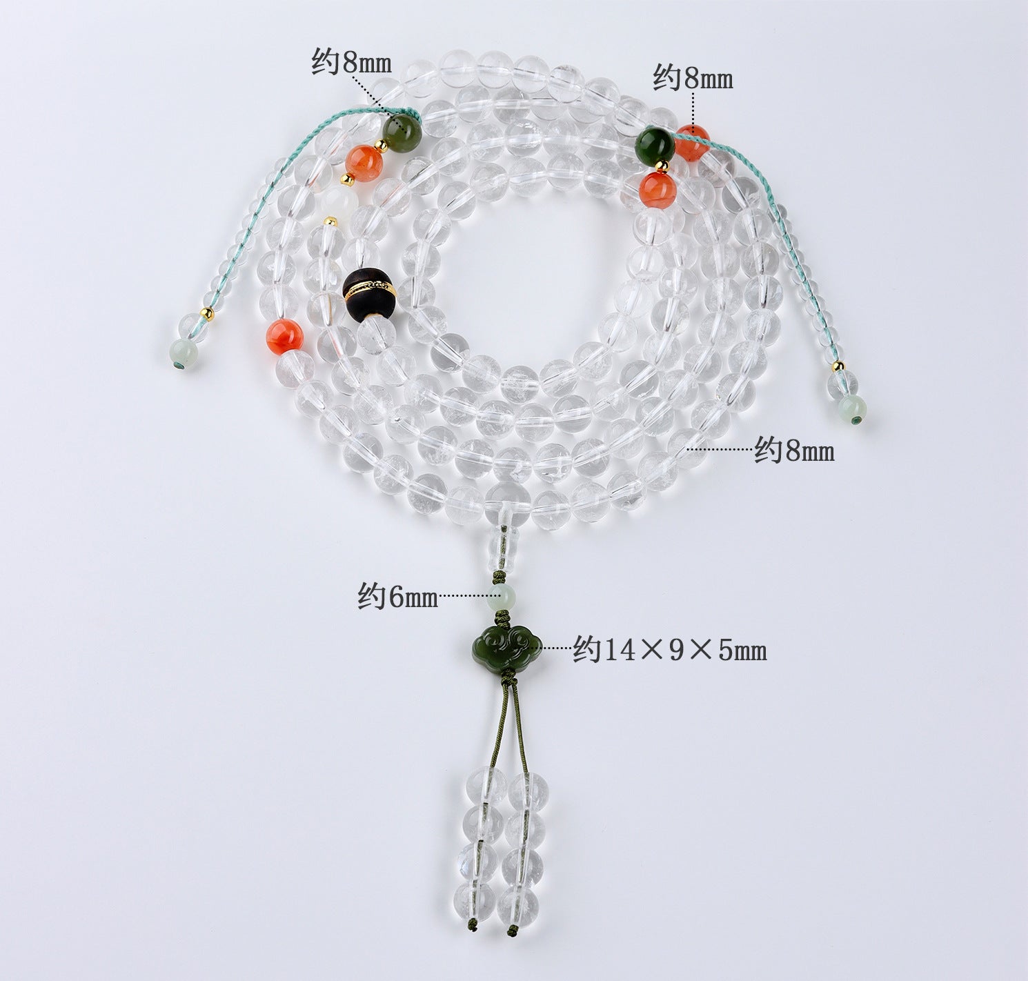 In the realm of spiritual adornments, white crystal has long been revered as a stone of purity and enlightenment. Known in ancient texts as the \"ice of the heavens,\" it embodies clarity and divine connection. This 108-bead bracelet, woven with natural white crystal, Hetian jade, and southern red agate, draws from Buddhist traditions where the number 108 signifies the earthly desires to overcome for inner peace. As the Heart Sutra proclaims: